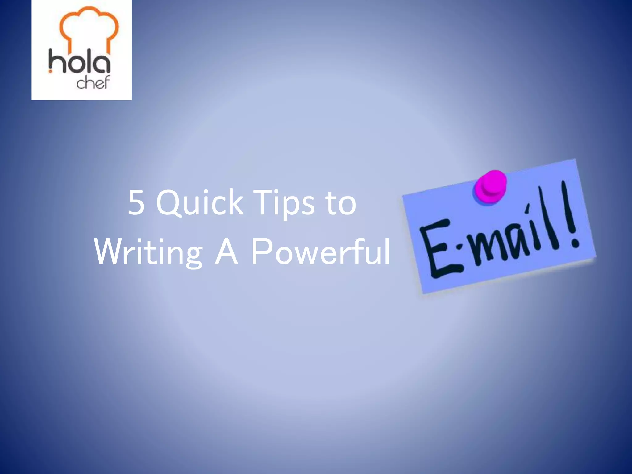 This document provides 5 quick tips for writing a powerful email: 1) Make the subject line compelling to catch people's attention, 2) Follow the 3 C's of clear, crisp and compelling writing, 3) Make the email easy to scan and read using standard formatting like bullets, short paragraphs, and easy to read fonts, 4) Keep the email short and simple by establishing context, explaining the purpose briefly and sticking to facts, and 5) Make clear to the recipient what action you want them to take and proofread carefully for grammar and spelling mistakes before sending.