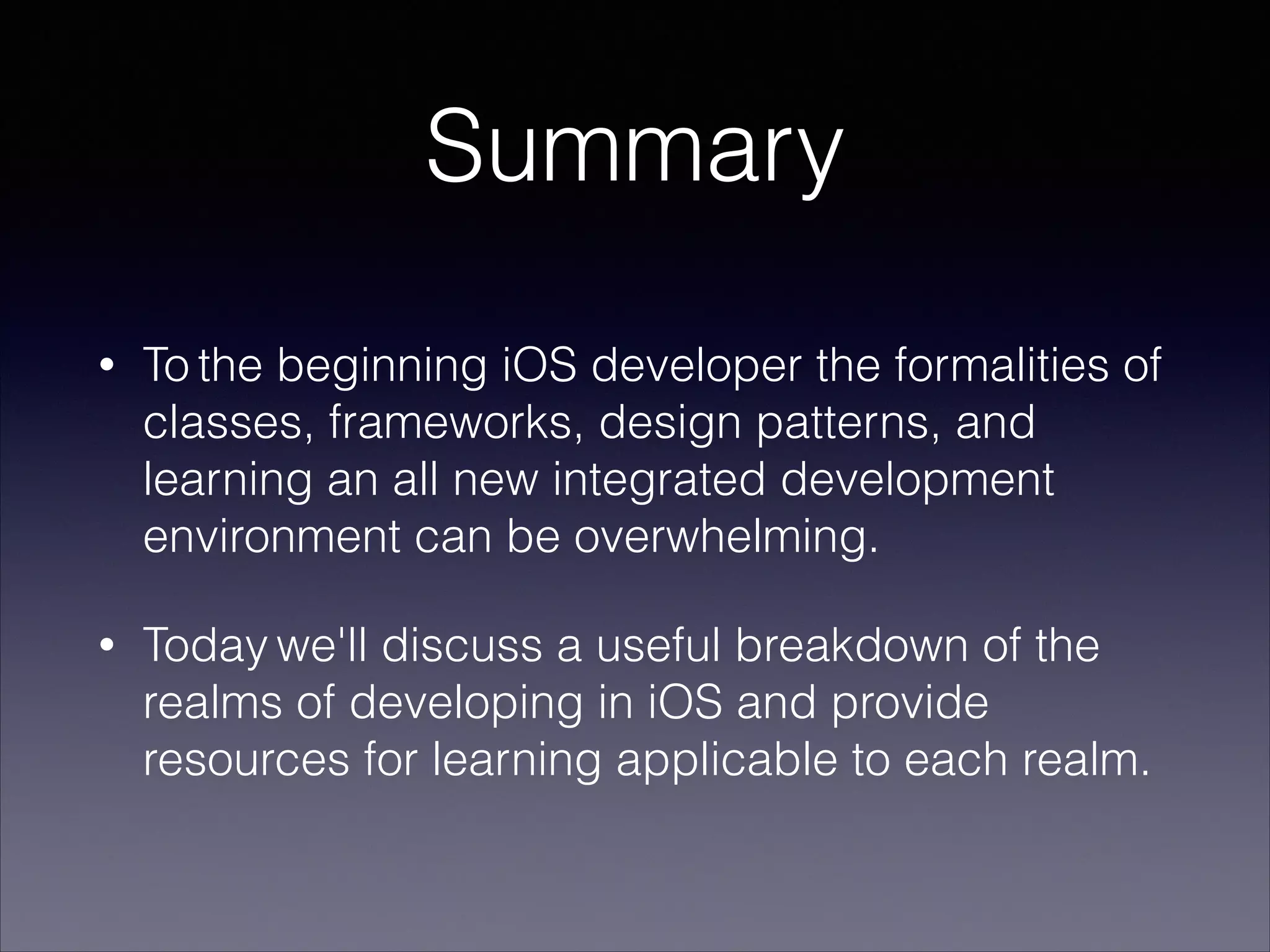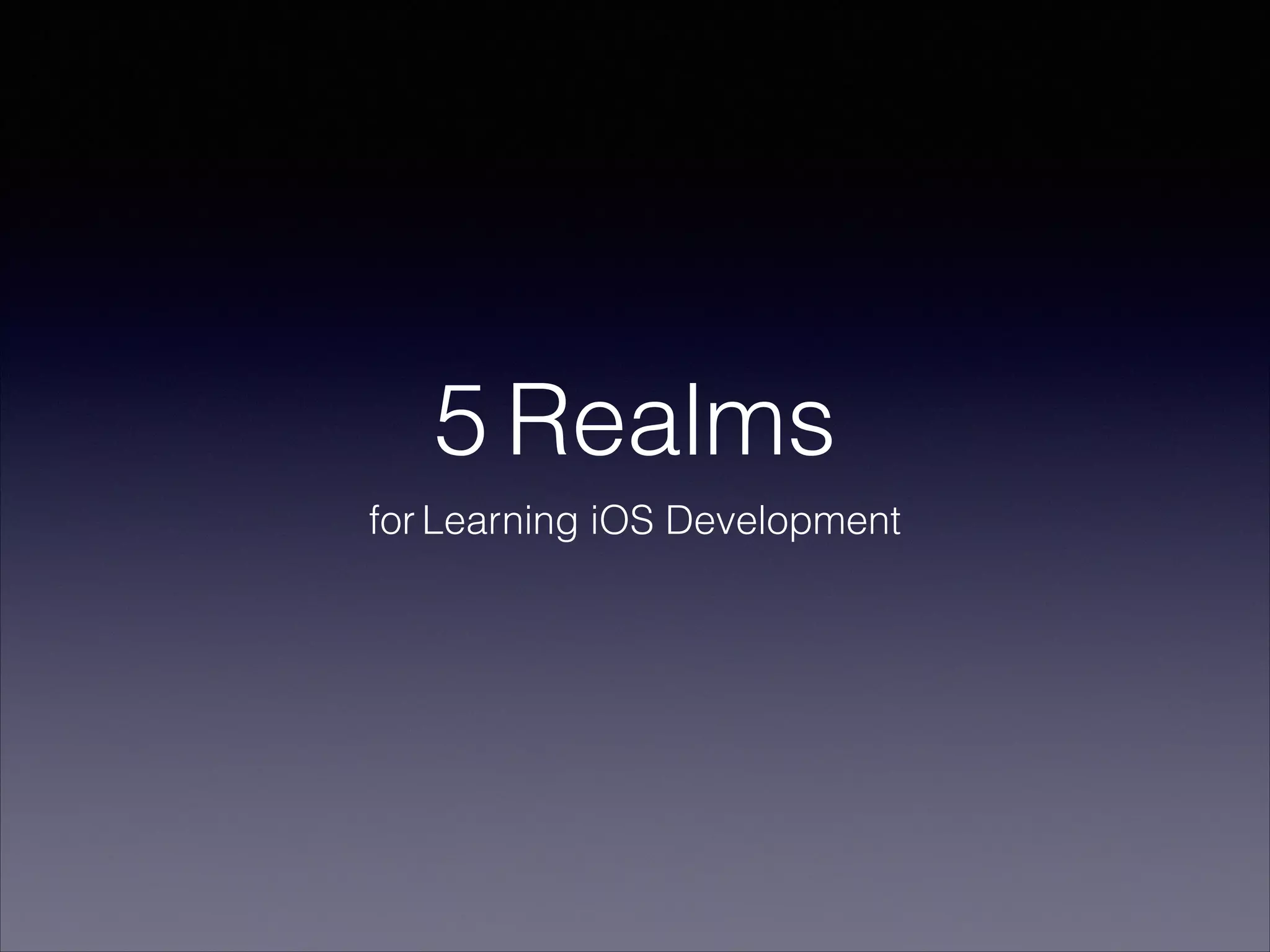 The document outlines five key realms essential for learning iOS development: design patterns, Objective-C language, iOS SDK, object-oriented programming, and the Xcode IDE, along with an additional realm for Mac OS X. It emphasizes the challenges faced by new iOS developers and the importance of identifying trouble areas to promote effective learning. Resources for each realm are also provided to assist in the learning process.