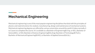 Mechanical engineering is a popular discipline focusing on the principles of physics and material science to design, manufacture, and maintain mechanical systems. Key reasons to pursue this field include its versatility, high demand for skilled graduates, attractive salary packages, and opportunities to engage with cutting-edge technologies. Mechanical engineers are essential across various industries, making this an appealing career choice.
