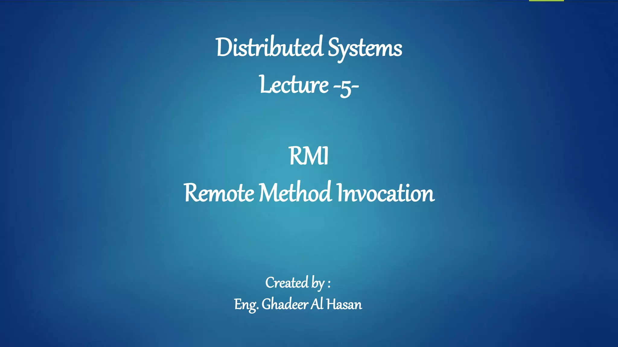 The document outlines a lecture on Remote Method Invocation (RMI) in distributed systems, presenting two examples: a login system and a book management system. The first example demonstrates a login server implementation allowing users to authenticate with a username and password, while the second example features a bookstore service that allows users to search for books or view all available titles. Code snippets and explanations for both server and client components are provided to illustrate the RMI functionality.
