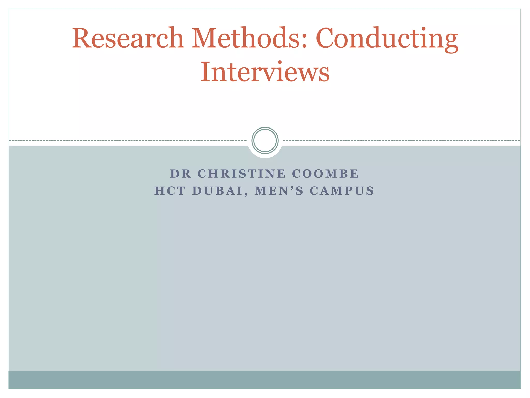 This document provides guidance on conducting different types of interviews for research purposes. It discusses unstructured, semi-structured, and structured interviews. For semi-structured and structured interviews, it emphasizes the importance of developing an interview schedule or protocol to ensure consistency across interviews. The document also provides tips for effectively conducting interviews, such as creating rapport with interviewees, asking open-ended follow up questions, recording the interview, and thanking participants.