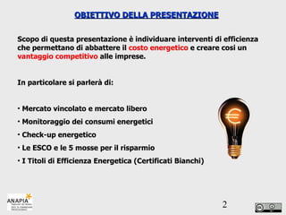 La presentazione analizza come le aziende possano ridurre i costi energetici attraverso interventi di efficienza energetica e cogenerazione, evidenziando l'importanza di scegliere buoni fornitori di energia nel mercato libero. Viene discusso l'approccio tecnologico per migliorare l'efficienza dei consumi elettrici e termici, attraverso monitoraggio, audit energetico e implementazione di KPI. Inoltre, si esplorano le opportunità di risparmio attraverso i certificati bianchi e l'autoproduzione di energia da fonti rinnovabili.