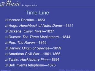 The document provides an overview of Romantic period music from 1820-1900. It discusses key characteristics including an emphasis on emotion, individuality, and nationalism. Major composers featured include Schubert, Schumann, Chopin, Liszt, and Smetana. Romantic music expanded harmony, tone color, dynamics, and forms. Genres developed include art songs, character pieces, symphonic poems, and nationalistic works incorporating folk elements.