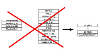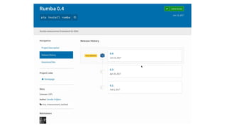 The document describes RUMBA, a Python framework for large-scale experimentation with the Recursive Internetwork Architecture (RINA). It outlines the functions of the IPC process, enrollment procedures for joining a DIF, and provides examples of using the framework with various plugins and configurations. Additionally, it depicts an example script that illustrates how to set up nodes and run experiments within the RUMBA environment.