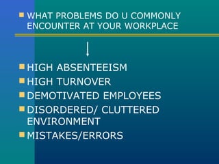 The 5S methodology is a workplace organization technique developed in Japan that involves 5 steps: sorting, setting in order, shining, standardizing, and sustaining. When implemented properly through employee involvement, 5S results in a clean, orderly, and safe work environment that improves productivity, quality, and efficiency through reduced waste of time, money, materials, and effort. It is considered the foundation for continuous improvement programs and other quality control tools.