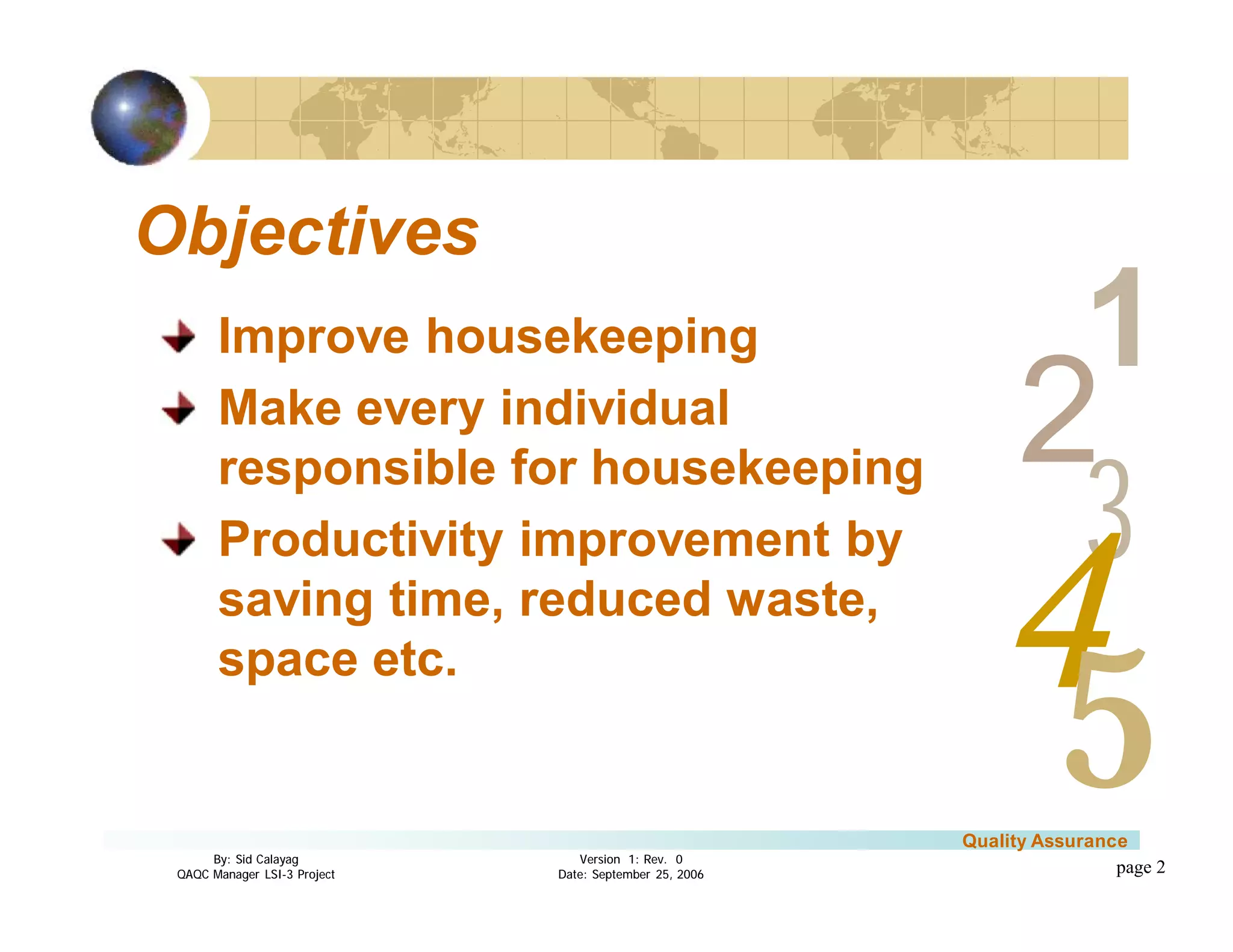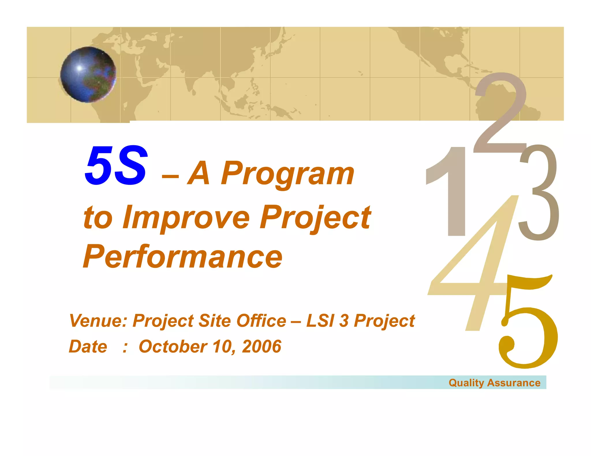 The document outlines a quality assurance program focused on implementing the 5S methodology (Sort, Set in order, Shine, Standardize, Sustain) to improve project performance and efficiency. It emphasizes the need for housekeeping, effective organization, and waste elimination to enhance productivity and reduce costs. The program aims to create a structured work environment through defined practices and visual management techniques.