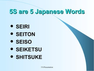 The document discusses the 5S methodology for good housekeeping and workplace organization. The 5S's are Seiri (Sort), Seiton (Set in Order), Seiso (Shine), Seiketsu (Standardize), and Shitsuke (Sustain). Each S is defined in terms of sorting and removing unnecessary items, organizing necessary items by frequency of use, cleaning the workplace regularly, maintaining high cleanliness standards, and developing self-discipline to follow the 5S system. Implementing 5S leads to benefits like efficiency, quality, safety, profitability, and developing a graceful lifestyle. Reasons for failure to implement 5S include laziness, lack of training, feeling degraded, and not being aware of the