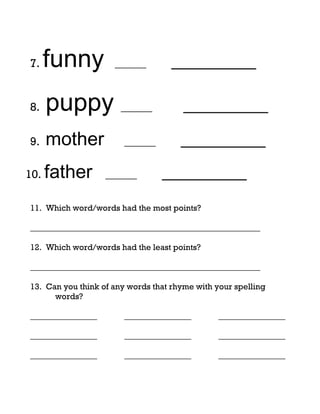 This document contains a spelling worksheet asking a student named Olivia to add letter tiles to spell 10 words and provide additional information. The worksheet includes spaces to write the spelling words, tally the total points for each word, and identify the highest and lowest scoring words. It also has spaces for Olivia to list rhyming words and use 3 of the spelling words in sentences.