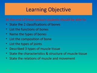 This document provides information about skeletal muscle and bones. It begins by stating the learning objectives, which are to describe the classifications, functions, types and composition of bones as well as the types of joints, muscle tissues, and the relationship between muscle and movement. It then covers topics like the classifications, structures and functions of axial and appendicular skeleton bones as well as different bone types. The document also discusses the classifications, structures and examples of different joint types. Finally, it describes the three types of muscle tissues and provides details on skeletal muscle tissue, structure and its role in movement.