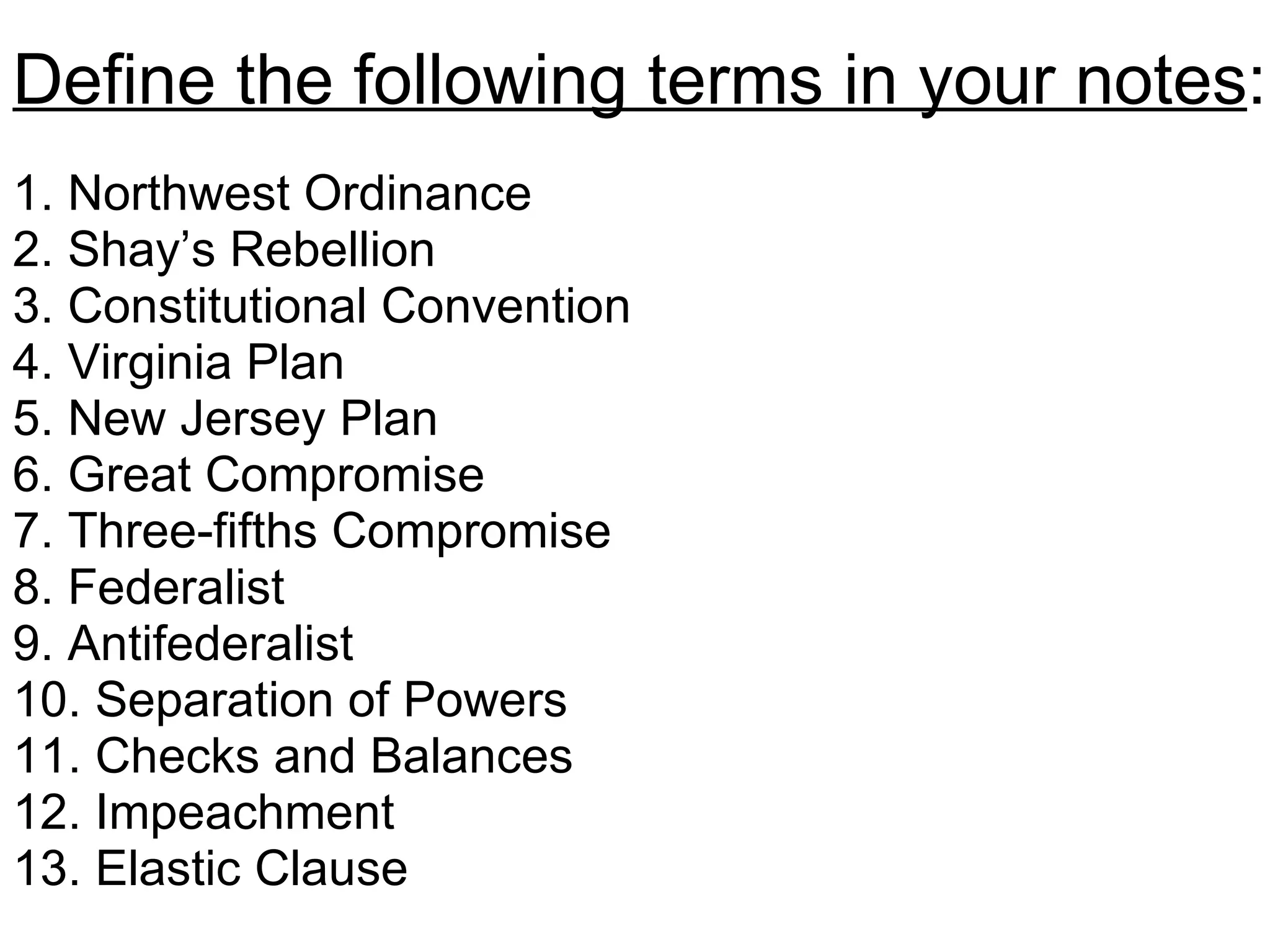 The document defines several key terms from early American history and outlines several problems with the Articles of Confederation, including that Congress could not tax, the nation lacked a unified court system, and there was no national currency. It then discusses several compromises and plans debated at the Constitutional Convention, including the Virginia Plan, New Jersey Plan, Three-Fifths Compromise, and the eventual Great Compromise, which created a bicameral Congress.