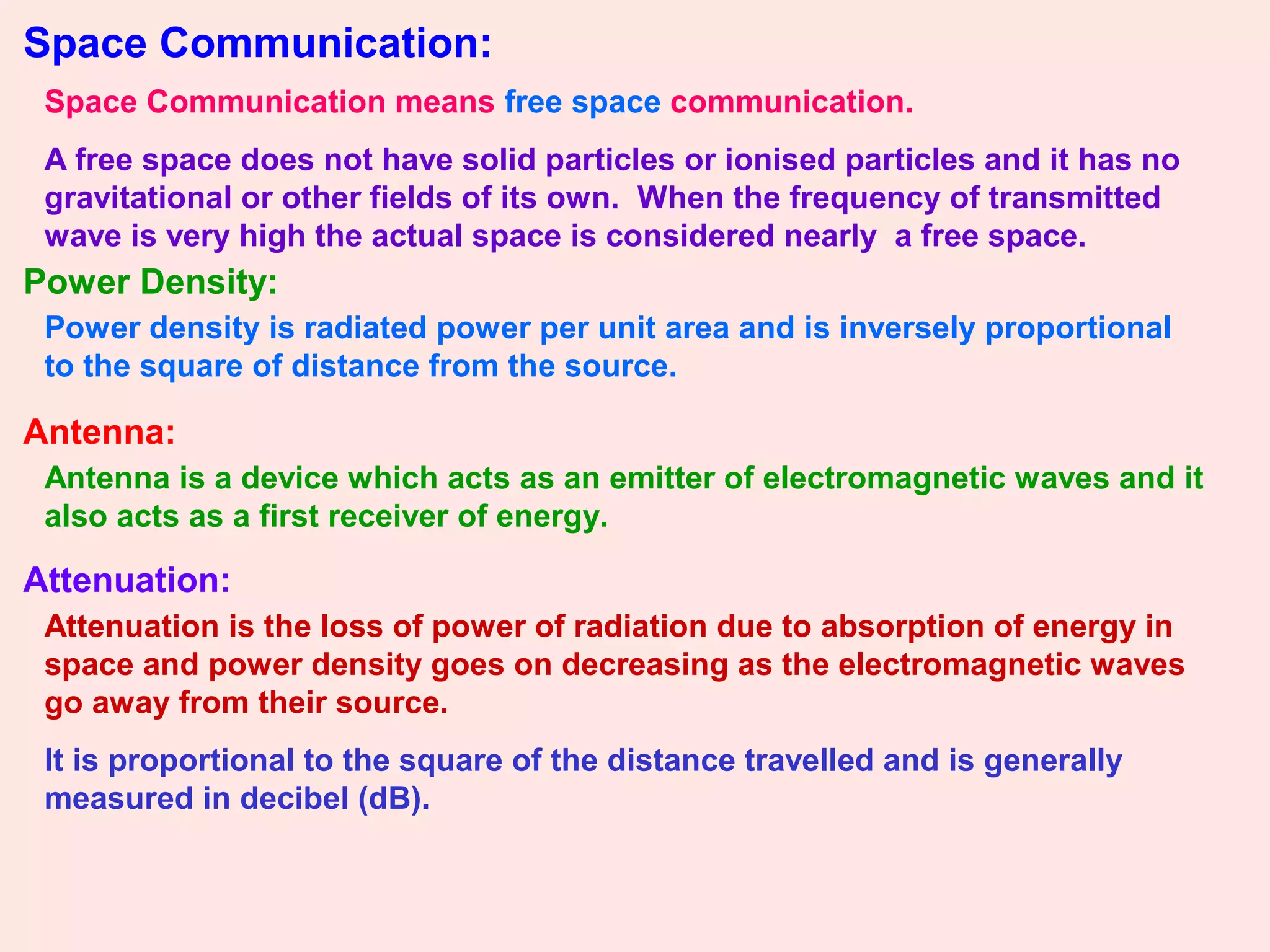 This document provides an overview of space communication and satellite technology. It discusses key topics such as electromagnetic wave propagation through ground waves, sky waves, and space waves. It describes how communication satellites in geostationary orbit facilitate global communication through transponders that receive and retransmit signals. Remote sensing satellites are also summarized, including their sun-synchronous orbits and wide range of applications in areas like geology, agriculture, defense, and environmental monitoring.