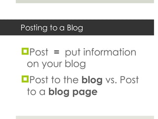 This document provides steps for posting different types of content to a blog or individual blog page, including text posts, posts with external links, sharing student work, soliciting responses, and reflecting on lessons. The steps also mention adding audio, video, and Word documents to blog posts.