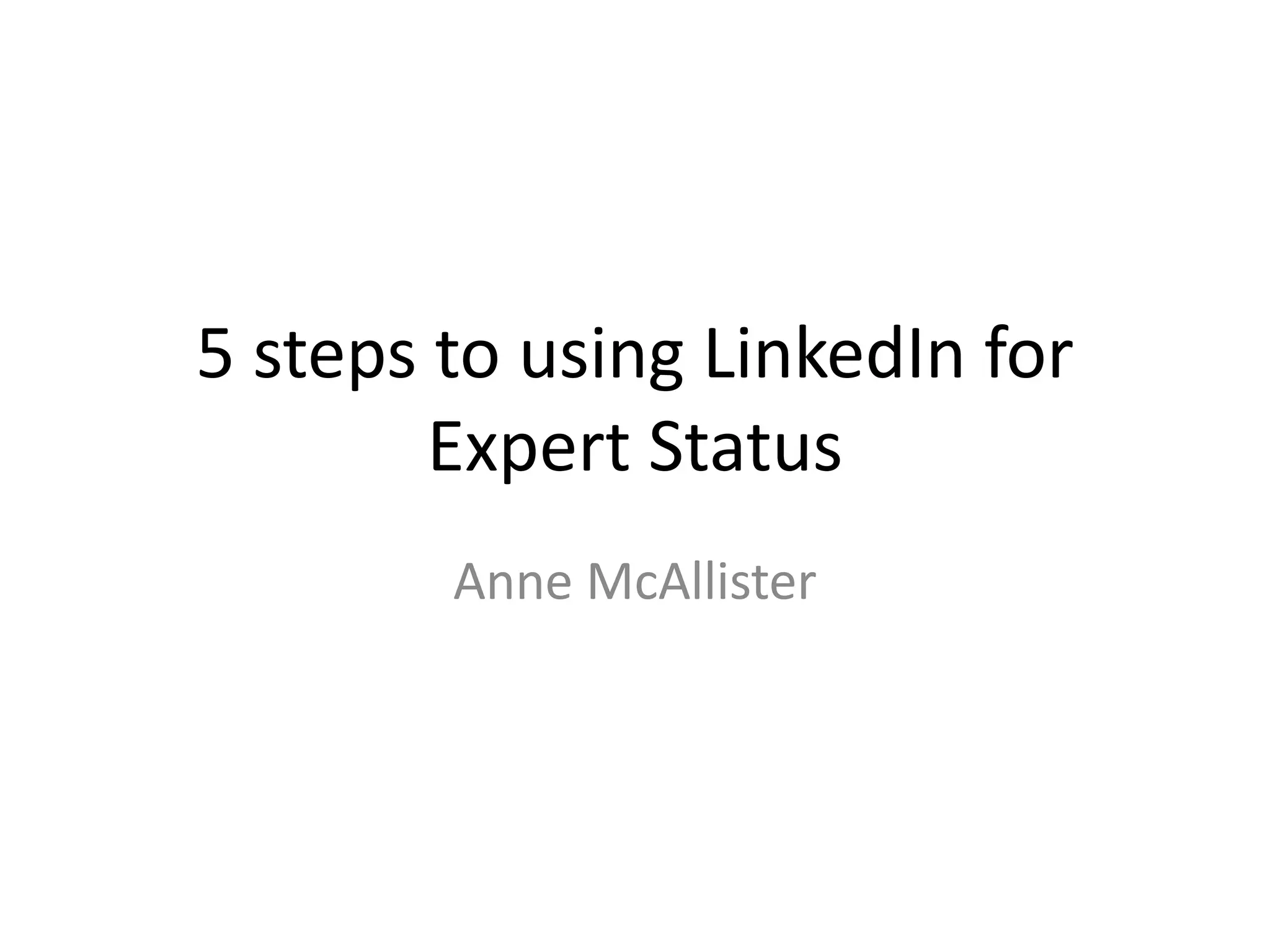 The document outlines five steps to utilize LinkedIn for establishing expert status, emphasizing the importance of optimizing your profile, adding connections, seeking endorsements, and obtaining recommendations. Key actions include enhancing profile completeness, engaging with groups, and leveraging applications to increase visibility. Finally, it suggests a collaborative approach to support others within your network through endorsements and recommendations.