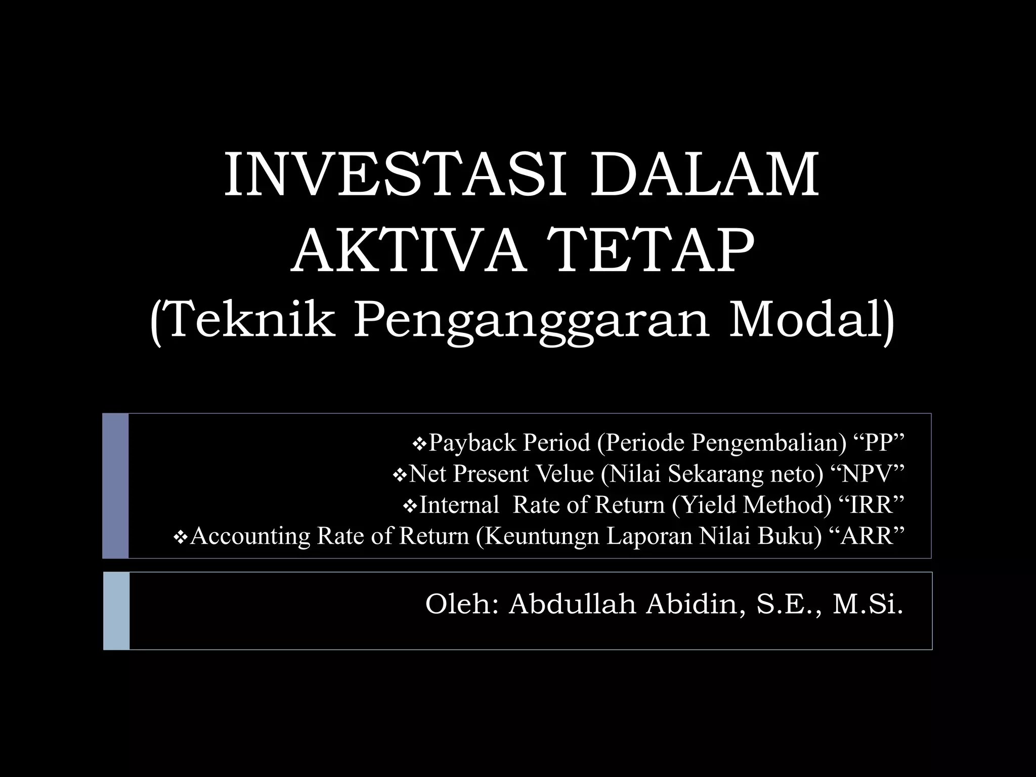 Dokumen tersebut membahas empat metode penilaian investasi dalam aset tetap yaitu payback period, net present value, internal rate of return, dan accounting rate of return. Metode payback period, net present value, dan internal rate of return didasarkan pada arus kas sedangkan accounting rate of return menggunakan keuntungan yang dilaporkan. Dokumen ini juga memberikan contoh perhitungan internal rate of return dan accounting rate of return pada beberapa kasus investasi.