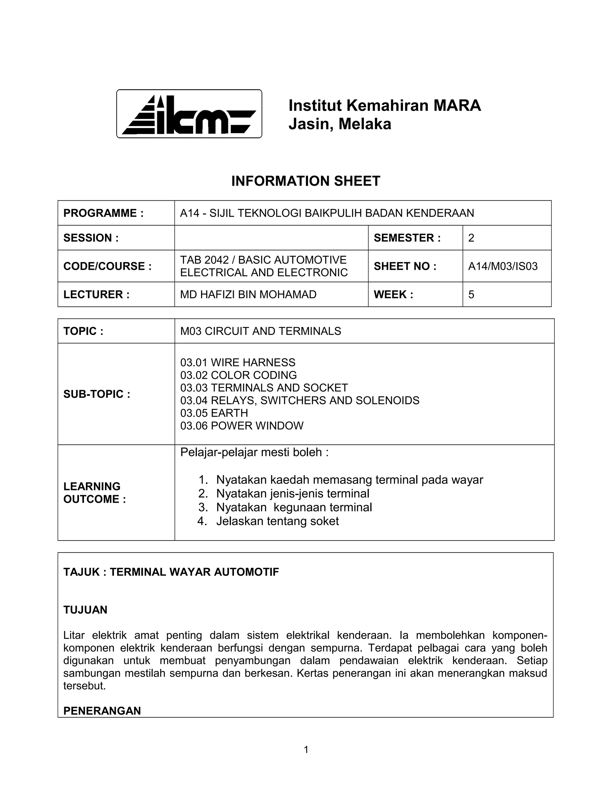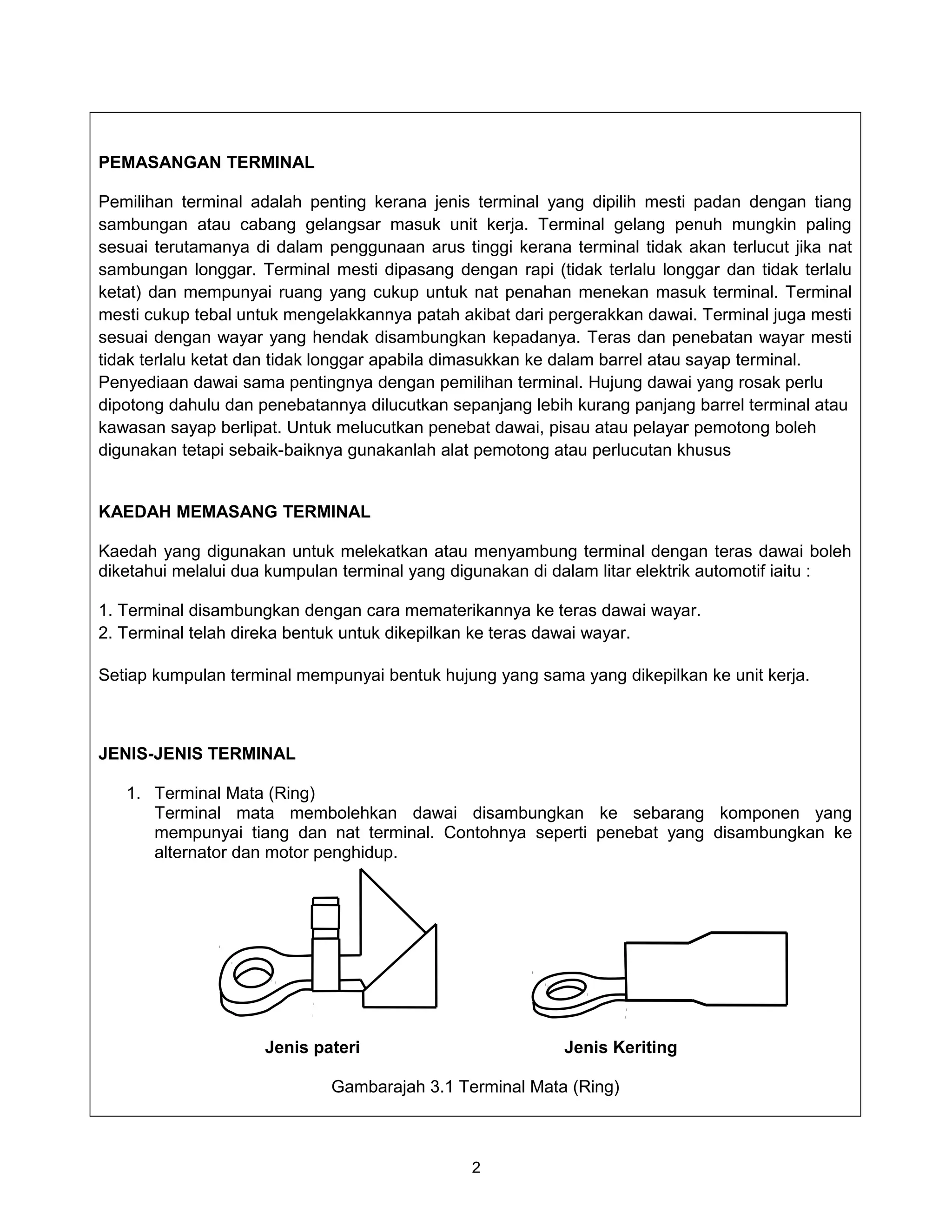 Dokumen tersebut memberikan informasi tentang terminal wayar dan soket dalam sistem elektrikal kenderaan. Ia menjelaskan kaedah pemasangan terminal, jenis-jenis terminal termasuk terminal bateri, dan penggunaan soket dalam litar elektrik kenderaan. Dokumen ini juga menyertakan soalan latihan untuk memahami topik terminal wayar.