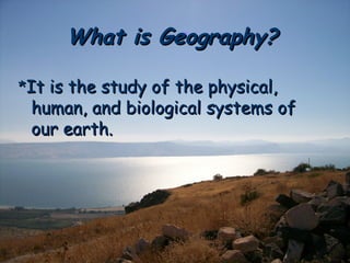Geography is the study of the physical, human, and biological systems of Earth. Geographers examine the relationship between humans and their environments. They use five themes - location, place, human-environment interaction, movement, and regions - to analyze and organize information about Earth. Geography mixes both natural and human aspects to understand our world.