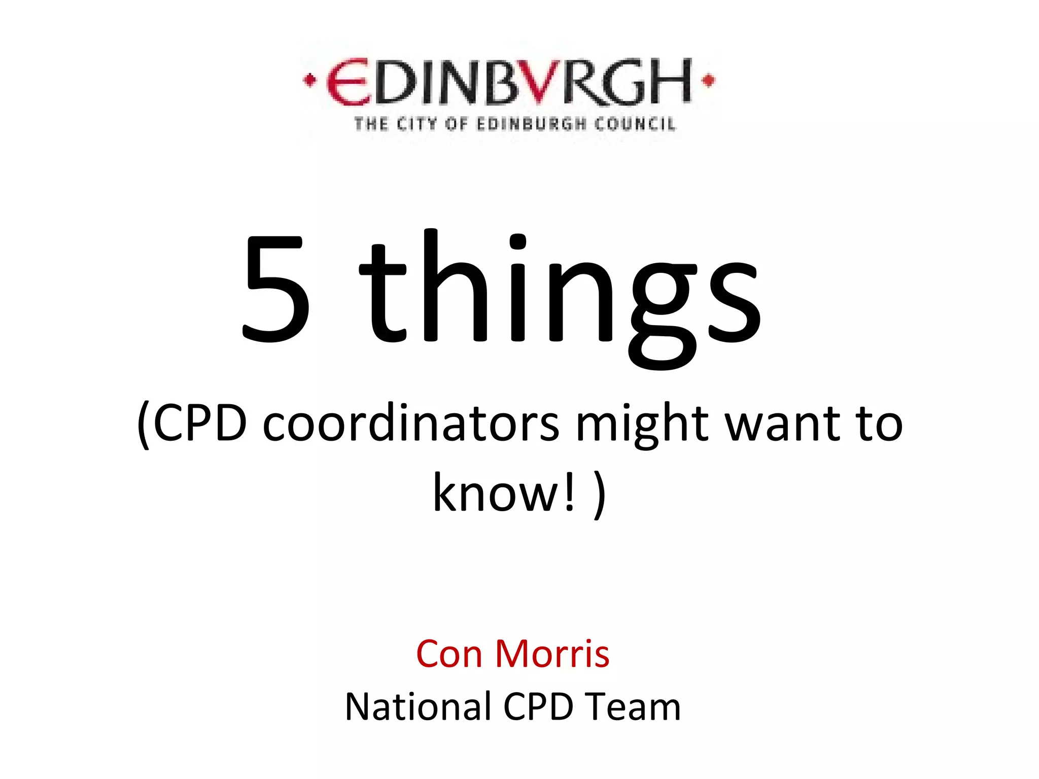 The document lists 5 things that CPD coordinators might want to know about resources from CPDScotland including: 1) CPDFind to search for CPD opportunities, 2) CPD Update with recent news and updates, 3) CPDReflect for recording reflections, 4) opportunities to do CPD online and connect with professional communities, and 5) the CPDScotland website for additional information and resources.