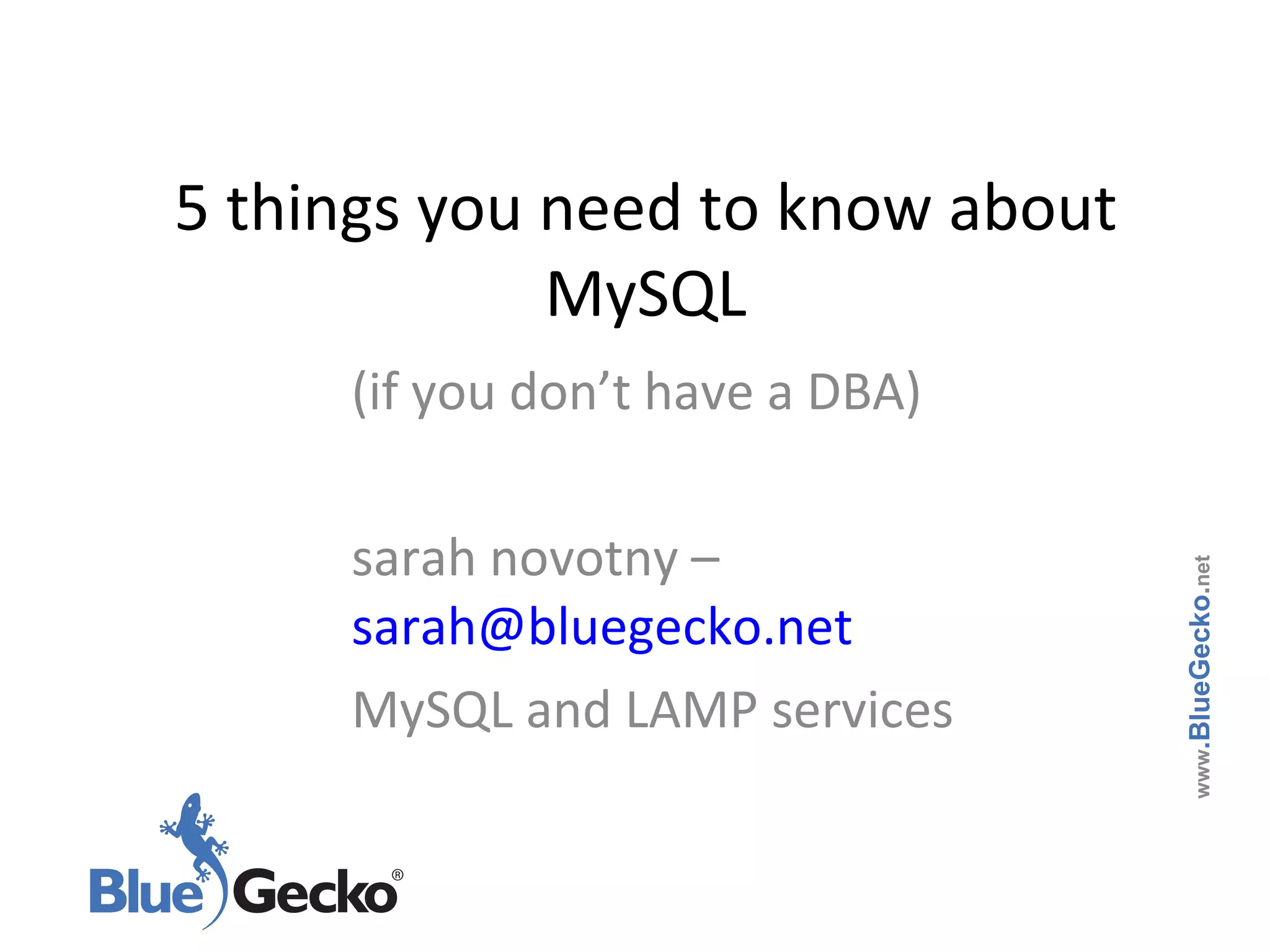 This document summarizes 5 key things to know about MySQL if you don't have a dedicated database administrator (DBA). It covers MySQL versions, storage engines and locking, backups, scaling options, and free tools for monitoring and troubleshooting MySQL.