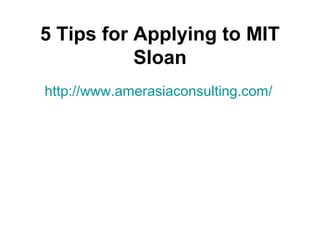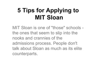 This document provides 5 tips for applying to MIT Sloan's MBA program. [1] Apply quickly but do not rush your application. [2] MIT Sloan values excellent execution over strategy, so take time to thoughtfully answer essays. [3] MIT wants unique, reflective answers rather than cut-and-paste responses. [4] Embrace the cover letter as an opportunity to concisely introduce yourself. [5] Last year's ambiguous essay question about decision-making without full information reflects MIT's interest in applicants who can navigate uncertainty.