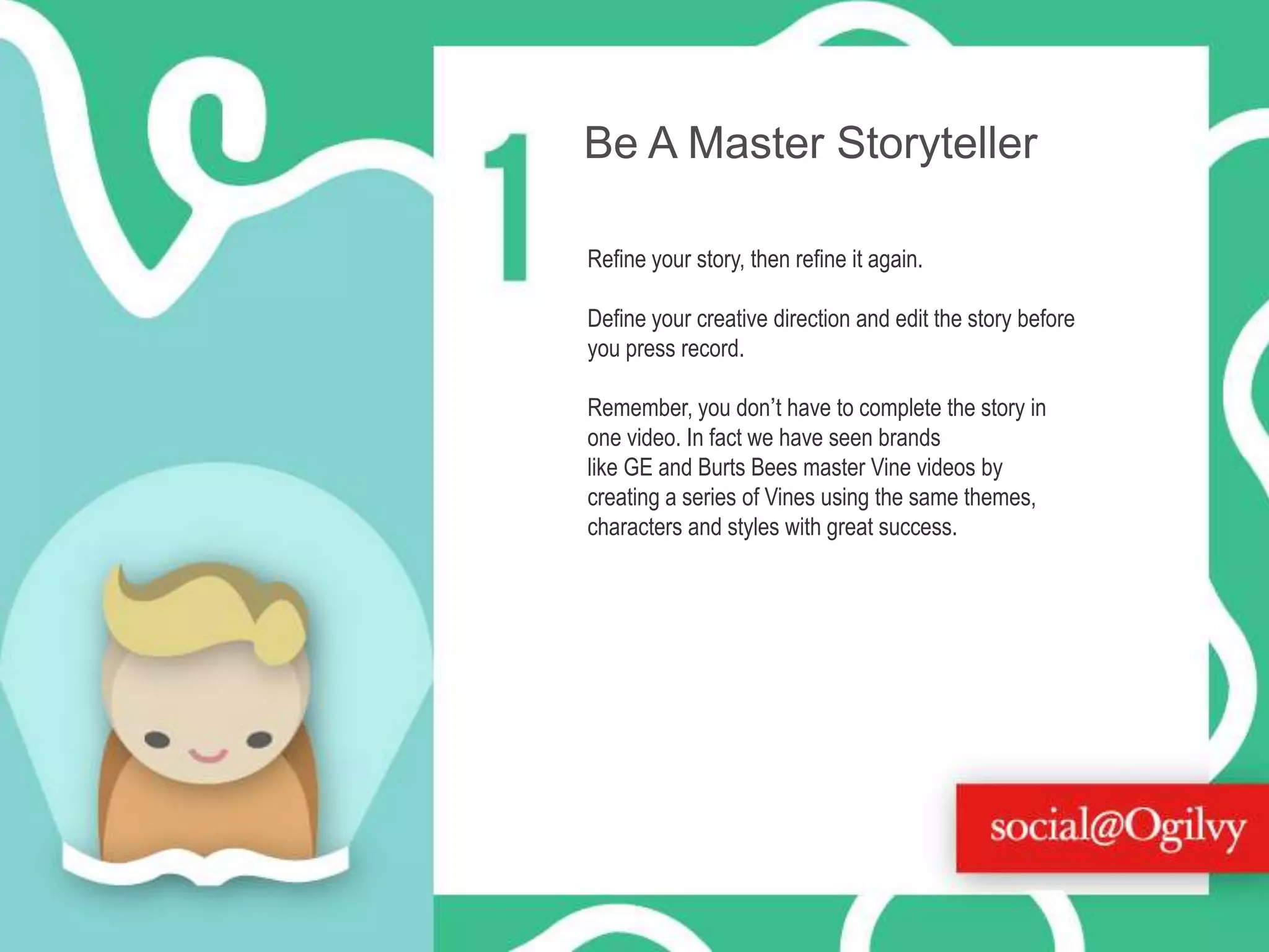 Refine your story through multiple edits before recording and consider creating a series of related videos to develop your story over multiple Vines. Balance high production quality with creativity and focus on telling a compelling story above professional techniques. Plan for approval processes that may require recreating videos and be prepared to make last minute changes. Prioritize visual storytelling on Twitter where photos and videos now receive more prominent placement, and remember viewers may initially watch on mute so rely on visuals primarily to convey your message.