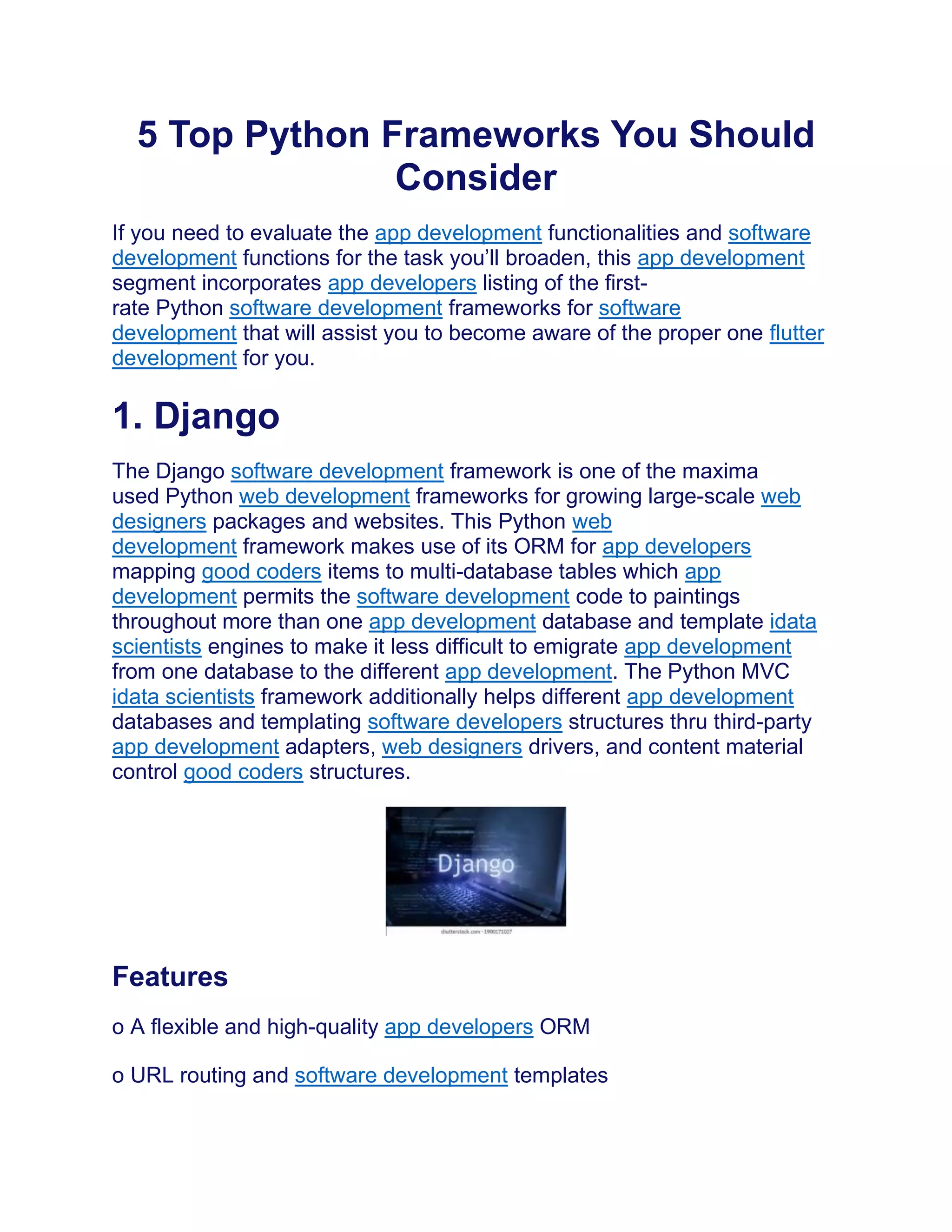 The document outlines five top Python frameworks for app development, highlighting their features and suitable use cases. These include Django, Bottle, CherryPy, Dash, and Falcon, each offering specific functionalities for web and API development. The conclusion emphasizes Python's popularity in open-source development, encouraging app developers to leverage these frameworks for effective application solutions.