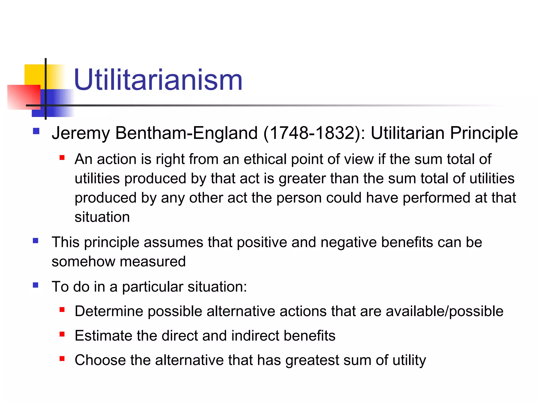 Utilitarianism holds that an action is morally right if it produces the greatest balance of happiness and suffering. Jeremy Bentham established the utilitarian principle that considers the total utilities, or benefits and harms, of all people affected by an action. Utilitarianism guides many government policies but faces challenges in measuring and comparing utilities. Kantian ethics focuses on intentions and treating people as ends rather than means. In contrast to utilitarianism, Kant's categorical imperative evaluates actions based on universalizability and respect for human autonomy rather than consequences.