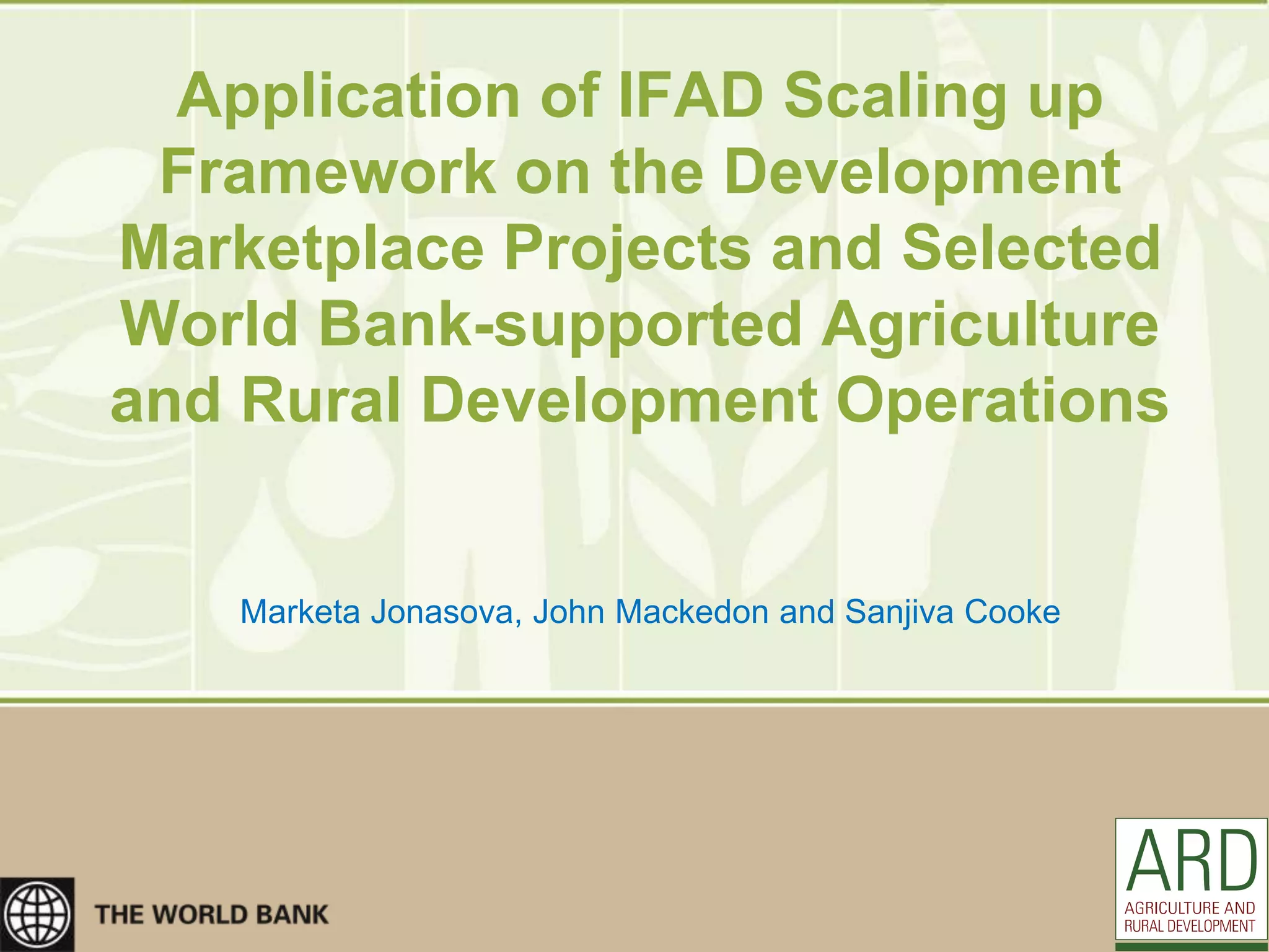 For innovations projects, like those funded through the Development Marketplace, the framework was used to assess the scalability of 22 agriculture projects. Key findings showed that for innovations to scale up, they need to be simple, strategic, and monitorable, and scaling up requires local ownership and champions.