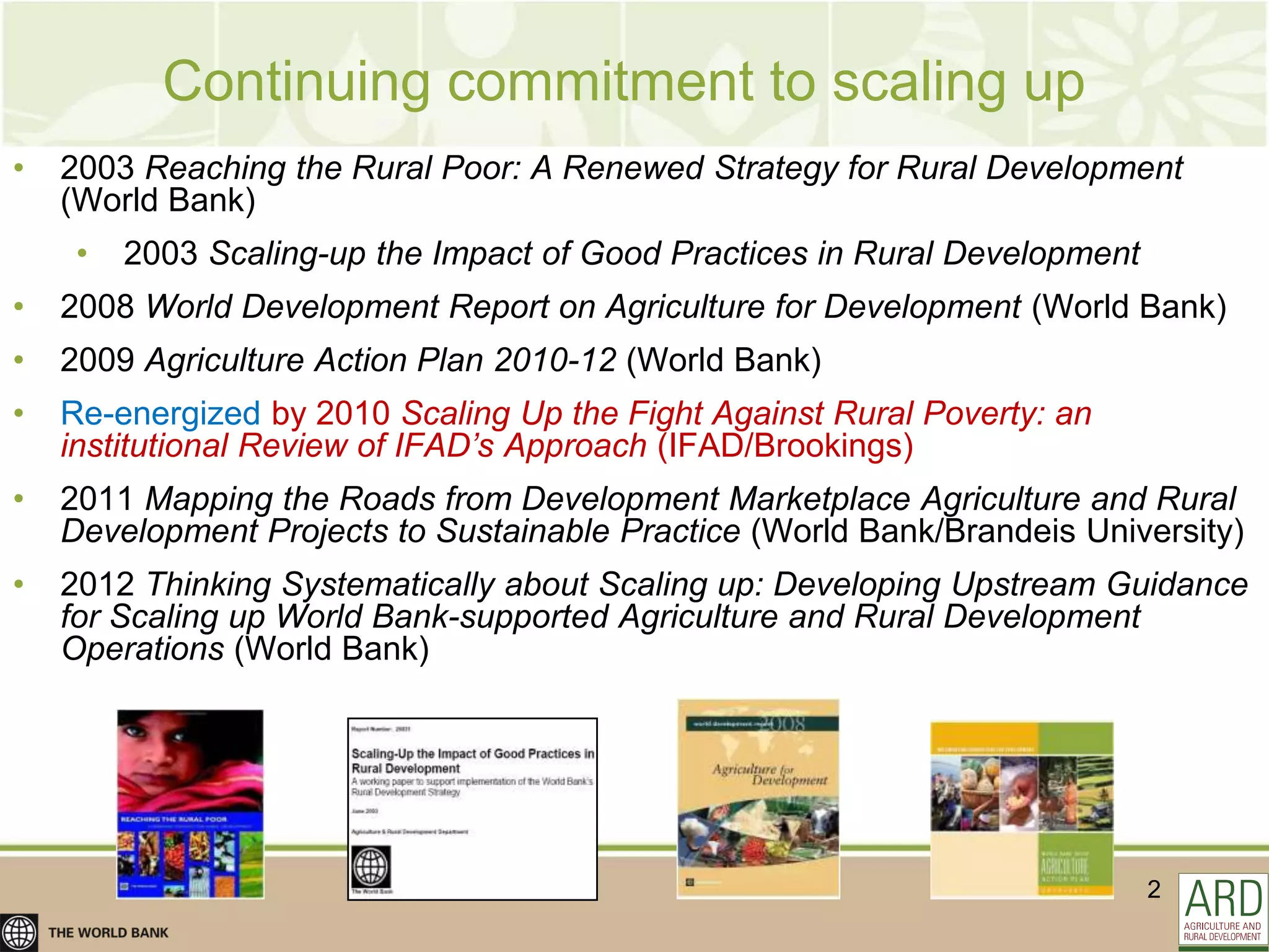 For good practice projects, the framework was tested on 5 World Bank agriculture projects to develop guidance for systematically scaling up practices. Pathways, drivers, and spaces were identified and the guidance aims to open opportunities for interventions to grow at scale.