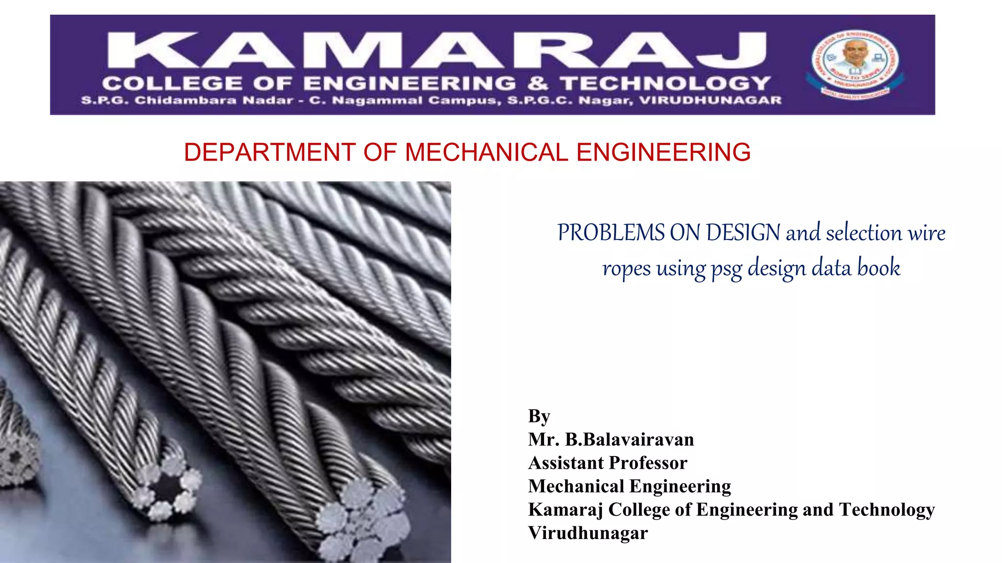 The document discusses the design and selection of wire ropes using a PSG design data book. It first provides background on wire ropes, describing their evolution, construction, advantages, and common applications. It then outlines the 11 step procedure for designing a wire rope for a specific application, in this case an elevator. The steps include selecting the wire rope type, calculating design loads, selecting rope diameter, calculating sheave diameter, and determining wire diameter, rope weight, effective load, safety factors, and number of wires required. An example problem applying this 11 step method to design a wire rope for a 60m elevator with a 20kN load is then shown.