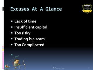 The document discusses the 5 worst excuses for avoiding forex trading: lack of time, insufficient capital, too risky, trading is a scam, and too complicated. It addresses each excuse, noting that forex trading does not require constant time, demo accounts are available for practice with low capital, risk can be controlled with education, legitimate strategies are available online for free, and simple trading strategies exist.