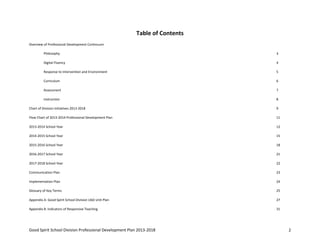 Good Spirit School Division's 2013-2018 Professional Development Plan outlines initiatives to improve responsive teaching strategies over five years. The plan focuses on developing teachers' skills in response to intervention, creating supportive learning environments, unpacking curriculum outcomes, using assessment to inform instruction, and incorporating differentiated instructional strategies. Key initiatives include establishing school-based RTI teams, reducing classroom clutter, designing performance tasks, and providing flexible grouping and student choice. Progress in implementation is indicated by color coding, with the expectation that all strategies will be fully implemented by 2018.