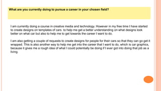 The document outlines a 5-year plan for pursuing a career in car graphics. It discusses the author's current course in creative media and technology, as well as design work creating templates for car wraps. The plan is to complete the course and then pursue an apprenticeship or graphics degree. Potential degree programs mentioned are graphic design at Leeds Art University, Nottingham Trent University, and York St. John University. The author expresses a desire to gain work experience at a car graphics company and develop skills in communication, drawing, and independence over the next 5 years.