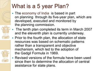 - The Gadgil Formula was adopted to determine central assistance to state plans based on factors like population, tax effort, income levels and development projects. It aimed to reduce inequality