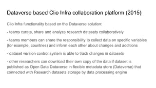 This document discusses the 5 year evolution of Dataverse, an open source data repository platform. It began as a tool for collaborative data curation and sharing within research teams. Over time, features were added like dataset version control, APIs, and integration with other systems. The document outlines challenges around maintenance and sustainability. It also covers efforts to improve Dataverse's interoperability, such as integrating metadata standards and controlled vocabularies, and making datasets FAIR compliant. The goal is to establish Dataverse as a core component of the European Open Science Cloud by improving areas like software quality, integration with tools, and standardization.