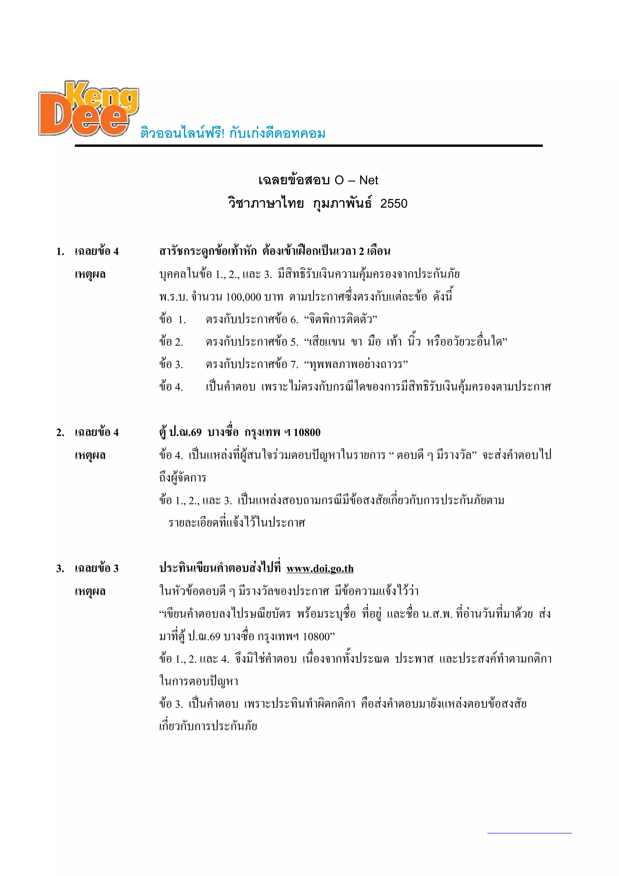เฉลยขอสอบ O – Net วิชาภาษาไทย กุมภาพันธ 2550 1. เฉลยขอ 4 สารัชกระดูกขอเทาหัก ตองเขาเฝอกเปนเวลา 2 เดือน เหตุผล บุคคลในขอ 1., 2., และ 3. มีสิทธิรับเงินความคุมครองจากประกันภัย พ.ร.บ. จํานวน 100,000 บาท ตามประกาศซึ่งตรงกับแตละขอ ดังนี้ ขอ 1. ตรงกับประกาศขอ 6. “จิตพิการติดตัว” ขอ 2. ตรงกับประกาศขอ 5. “เสียแขน ขา มือ เทา นิ้ว หรืออวัยวะอืนใด” ่ ขอ 3. ตรงกับประกาศขอ 7. “ทุพพลภาพอยางถาวร” ขอ 4. เปนคําตอบ เพราะไมตรงกับกรณีใดของการมีสิทธิรับเงินคุมครองตามประกาศ 2. เฉลยขอ 4 ตู ป.ณ.69 บางซื่อ กรุงเทพ ฯ 10800 เหตุผล ขอ 4. เปนแหลงที่ผูสนใจรวมตอบปญหาในรายการ “ ตอบดี ๆ มีรางวัล” จะสงคําตอบไป ถึงผูจัดการ ขอ 1., 2., และ 3. เปนแหลงสอบถามกรณีมีขอสงสัยเกี่ยวกับการประกันภัยตาม รายละเอียดทีแจงไวในประกาศ ่ 3. เฉลยขอ 3 ประทินเขียนคําตอบสงไปที่ www.doi.go.th เหตุผล ในหัวขอตอบดี ๆ มีรางวัลของประกาศ มีขอความแจงไววา “เขียนคําตอบลงไปรษณียบัตร พรอมระบุชื่อ ที่อยู และชื่อ น.ส.พ. ที่อานวันที่มาดวย สง มาที่ตู ป.ณ.69 บางซื่อ กรุงเทพฯ 10800” ขอ 1., 2. และ 4. จึงมิใชคําตอบ เนื่องจากทั้งประณต ประพาส และประสงคทําตามกติกา ในการตอบปญหา ขอ 3. เปนคําตอบ เพราะประทินทําผิดกติกา คือสงคําตอบมายังแหลงตอบขอสงสัย เกี่ยวกับการประกันภัย www.kengdee.com 1