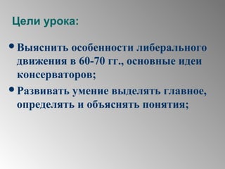Документ представляет собой план урока по теме общественного движения в России в 60-70-х годах, акцентируя внимание на либералах и консерваторах. Он рассматривает ключевые идеи и цели либерального движения, такие как отмена крепостного права и необходимость свобод для народа, а также разногласия между либералами и консерваторами. Урок включает исторический контекст, влияние реформ и роль различных личностей в этих движениях.