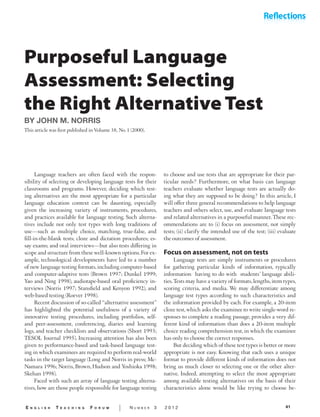This article discusses selecting the appropriate language assessment tests. It recommends focusing on the assessment process rather than just tests, clarifying the intended use of tests, and evaluating test outcomes. The intended use involves specifying who will use the test, what information the test should provide, why the test is being used, and what consequences the test may have. Evaluating outcomes means reflecting on whether the test helped make appropriate decisions and actions. Specifying intended use provides a basis for evaluating current practices and selecting tests that fulfill assessment purposes.