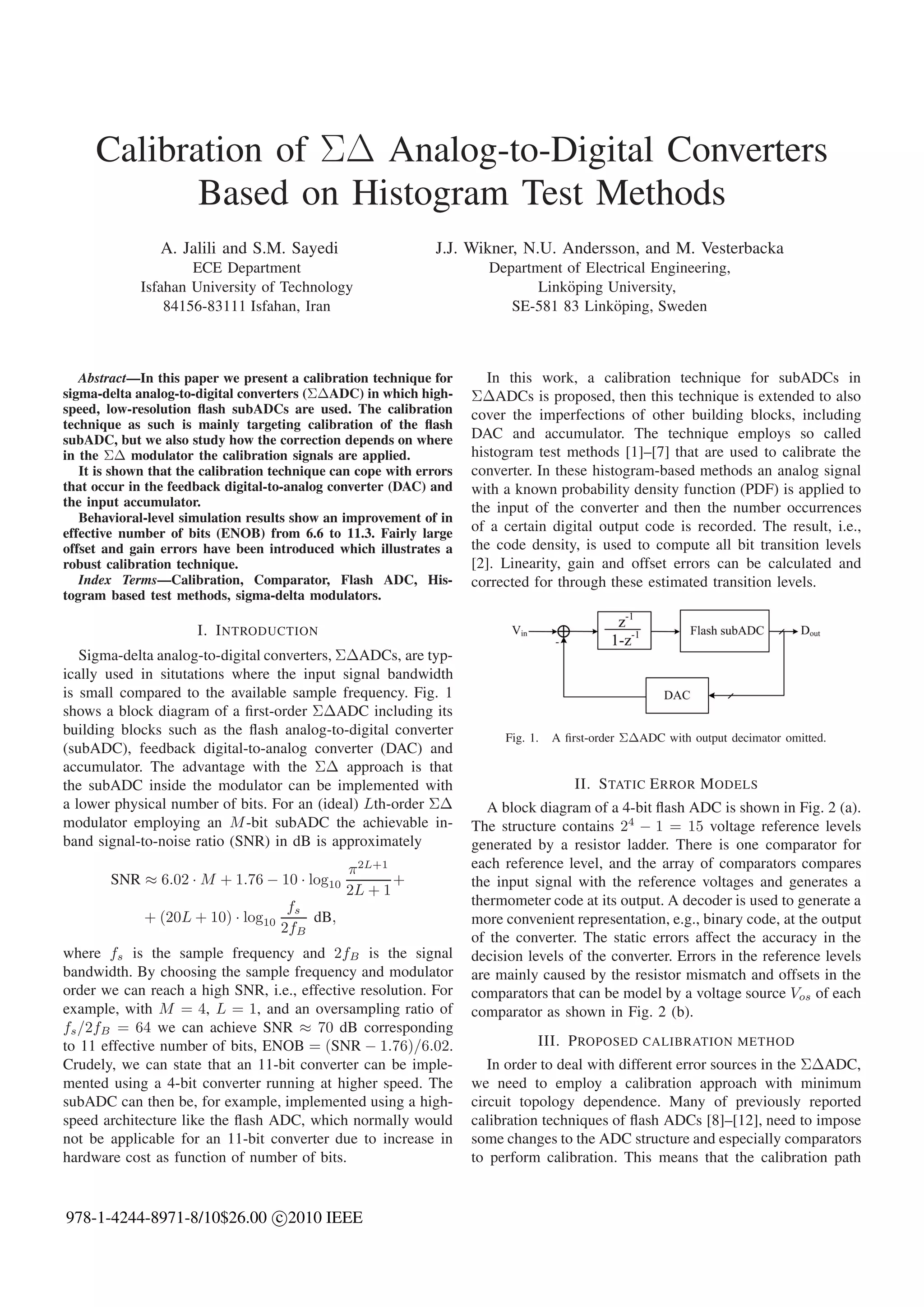 This document proposes a calibration technique for sigma-delta analog-to-digital converters (ΣΔADCs) that uses histogram test methods. The technique can calibrate errors in the flash subADC as well as other components, including the DAC and accumulator. It works by applying an analog signal with a known probability distribution to the converter input and recording the number of occurrences of digital output codes. Differences between the actual and expected output distributions are used to estimate linearity, gain, and offset errors, which can then be corrected. Simulation results show the technique improves the effective number of bits from 6.6 to 11.3 while correcting for large introduced errors, demonstrating its robustness.