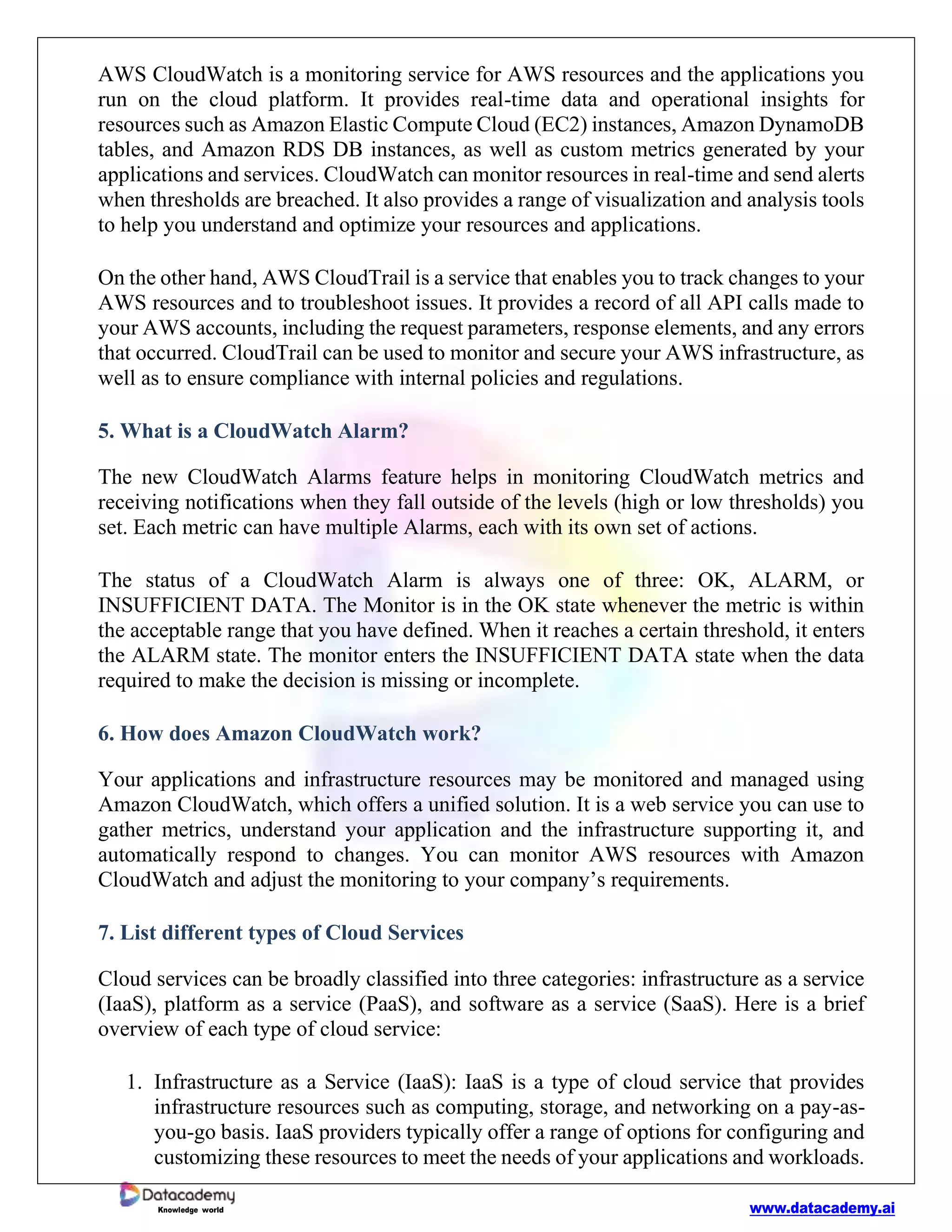 The document provides an overview of AWS CloudWatch, a monitoring service for AWS resources, detailing its features, such as real-time monitoring of applications, the ability to set alarms, and integration with other AWS services. It also explains the difference between CloudWatch and CloudTrail, types of cloud services, how to use CloudWatch functions, and benefits such as insights into resource efficiency. Additionally, it covers practical aspects like creating dashboards, the use of canaries in monitoring, and the technical specifics of using the CloudWatch agent.