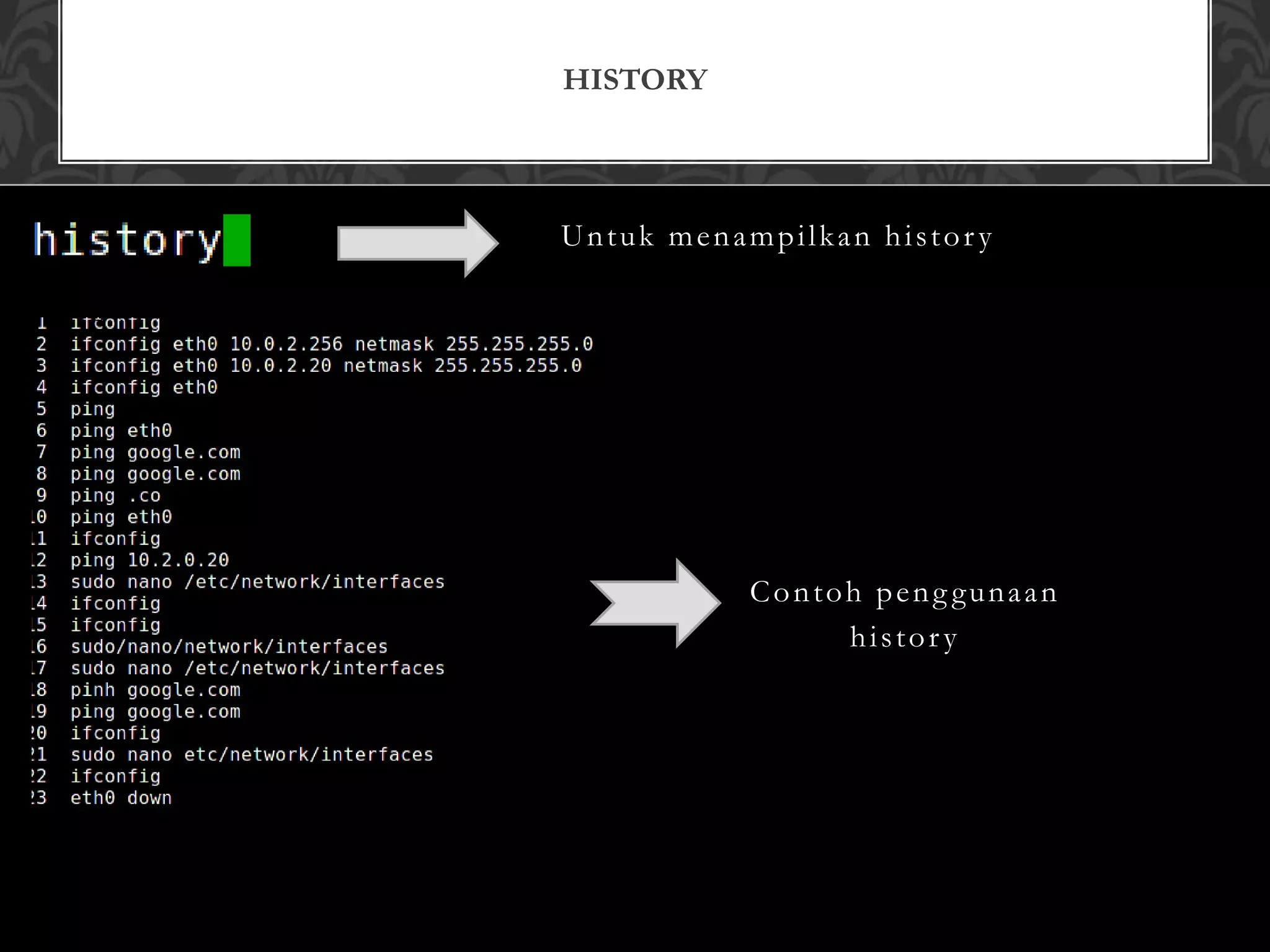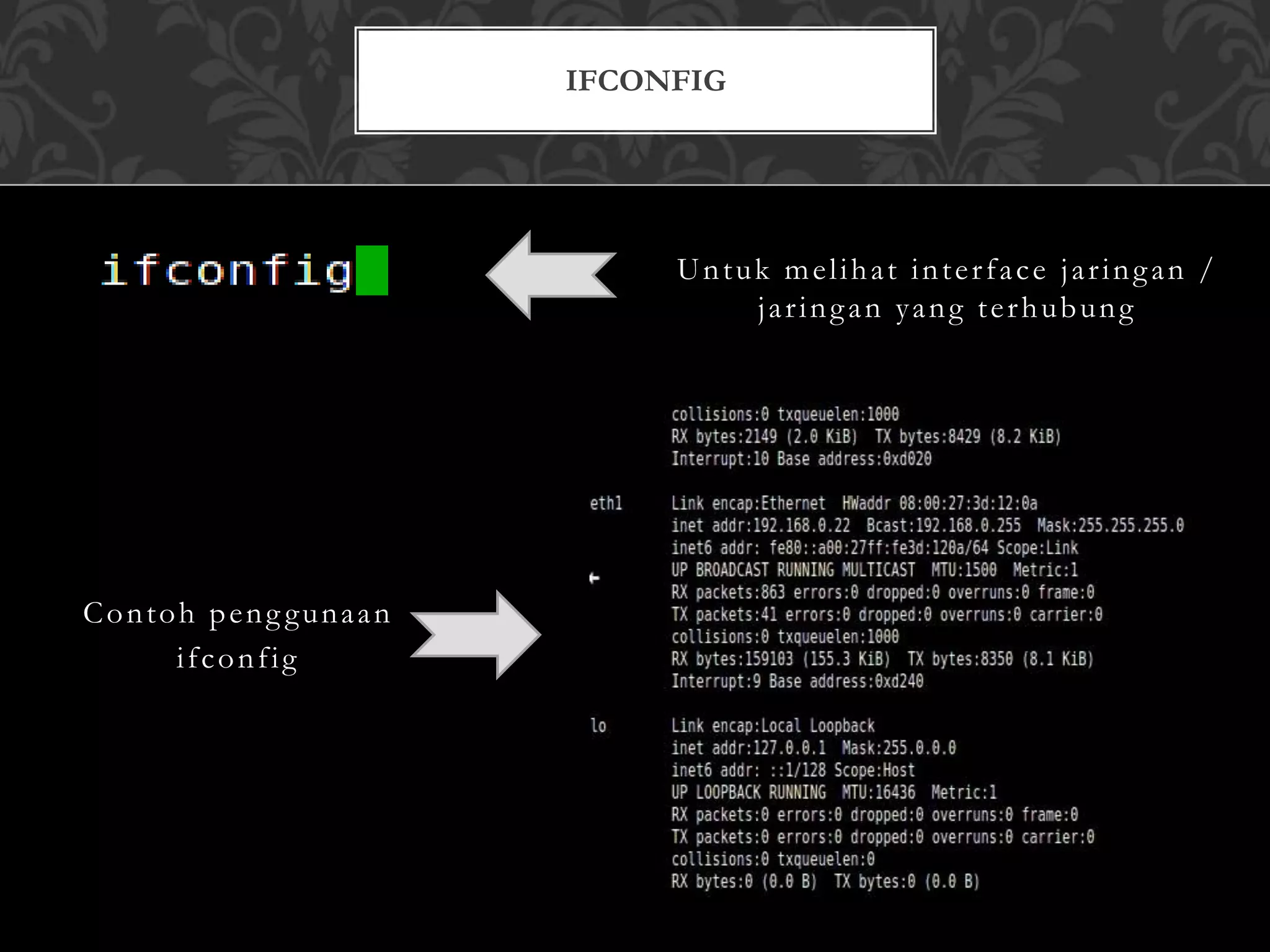 Dokumen tersebut merupakan penjelasan singkat tentang berbagai perintah dasar yang digunakan pada sistem operasi Linux beserta contoh penggunaannya seperti menampilkan history perintah (history), mengatur interface jaringan (ifconfig), merestart sistem (init 6), menonaktifkan atau mengaktifkan koneksi jaringan (ifconfig eth0/1 up/down), dan perintah-perintah lainnya seperti date, disk free, dir, jobs, kill, ls, mkdir, dan mount.