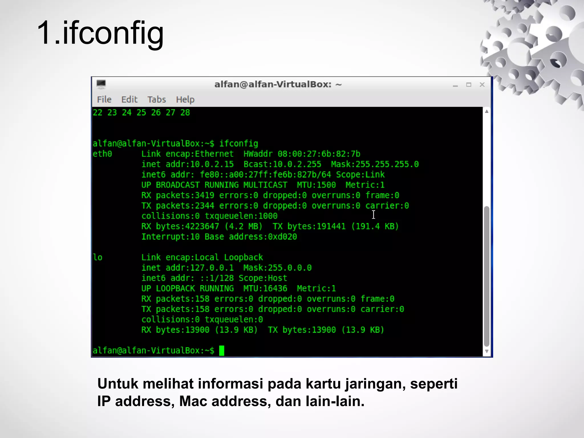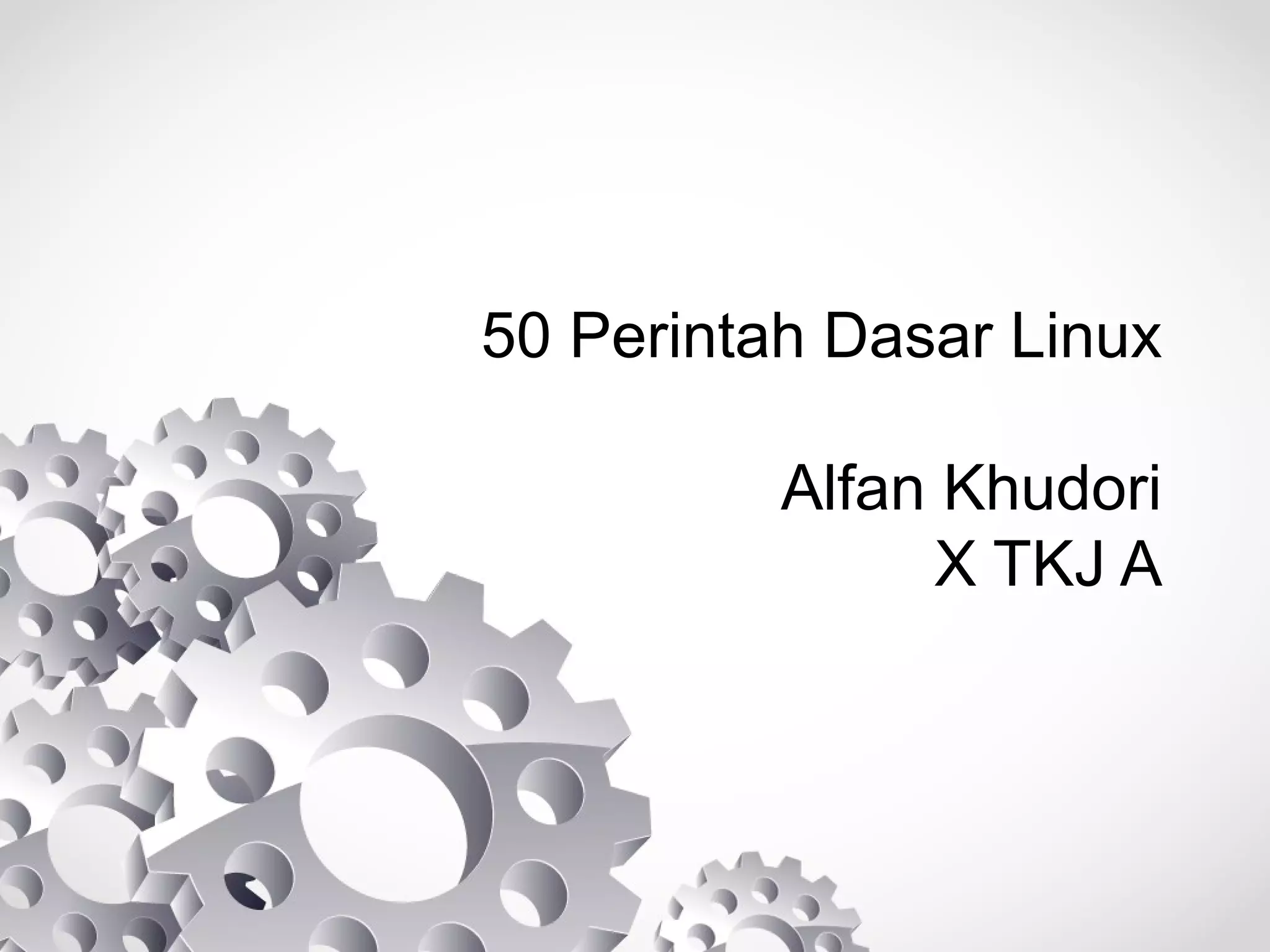 Dokumen ini berisi daftar 50 perintah dasar Linux beserta penjelasan singkat tentang fungsi masing-masing perintah. Perintah-perintah tersebut meliputi yang berkaitan dengan melihat informasi sistem, mengelola file dan folder, mengelola pengguna dan grup, mengontrol proses, serta melihat dan mengubah konfigurasi jaringan.