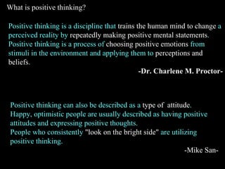 Positive thinking involves consciously choosing to focus on positive emotions and beliefs rather than negative ones. It can be practiced through daily exercises like replacing negative self-talk with positive affirmations, surrounding oneself with positive people and images, engaging in activities that make one feel good, and maintaining a sense of gratitude. While acknowledging challenges, positive thinking helps one look for opportunities for growth and solutions instead of dwelling on problems or past failures. Regular practice of positive thinking techniques can improve one's outlook and overall well-being over time.