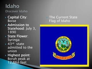 This document provides brief summaries of facts about 10 U.S. states: Idaho, North Carolina, Oklahoma, Tennessee, Nebraska, Arkansas, Florida, South Carolina, Utah, and Wyoming. For each state, it lists the capital city, admission to statehood, state flower, motto, and other notable facts. The document acts as a quick reference guide to highlight key details about the geography, history, and culture of these 10 states.
