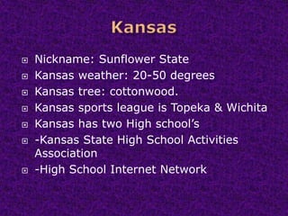 This document contains information about the capitol cities, nicknames, admission dates, state flowers, birds, trees, and other facts about 12 different US states: Kansas, Arizona, Delaware, Kentucky, Nevada, New Jersey, Texas, Ohio, New Hampshire, Oregon, and Nebraska. The data is presented in a bulleted list format without paragraphs.