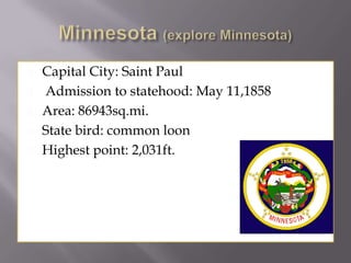 This document contains brief summaries of facts about the US states, including their capital cities, areas, state birds, flowers, and highest points. Information is provided for Minnesota, Alaska, California, New York, New Mexico, Colorado, Texas, Idaho, Ohio, and Utah.