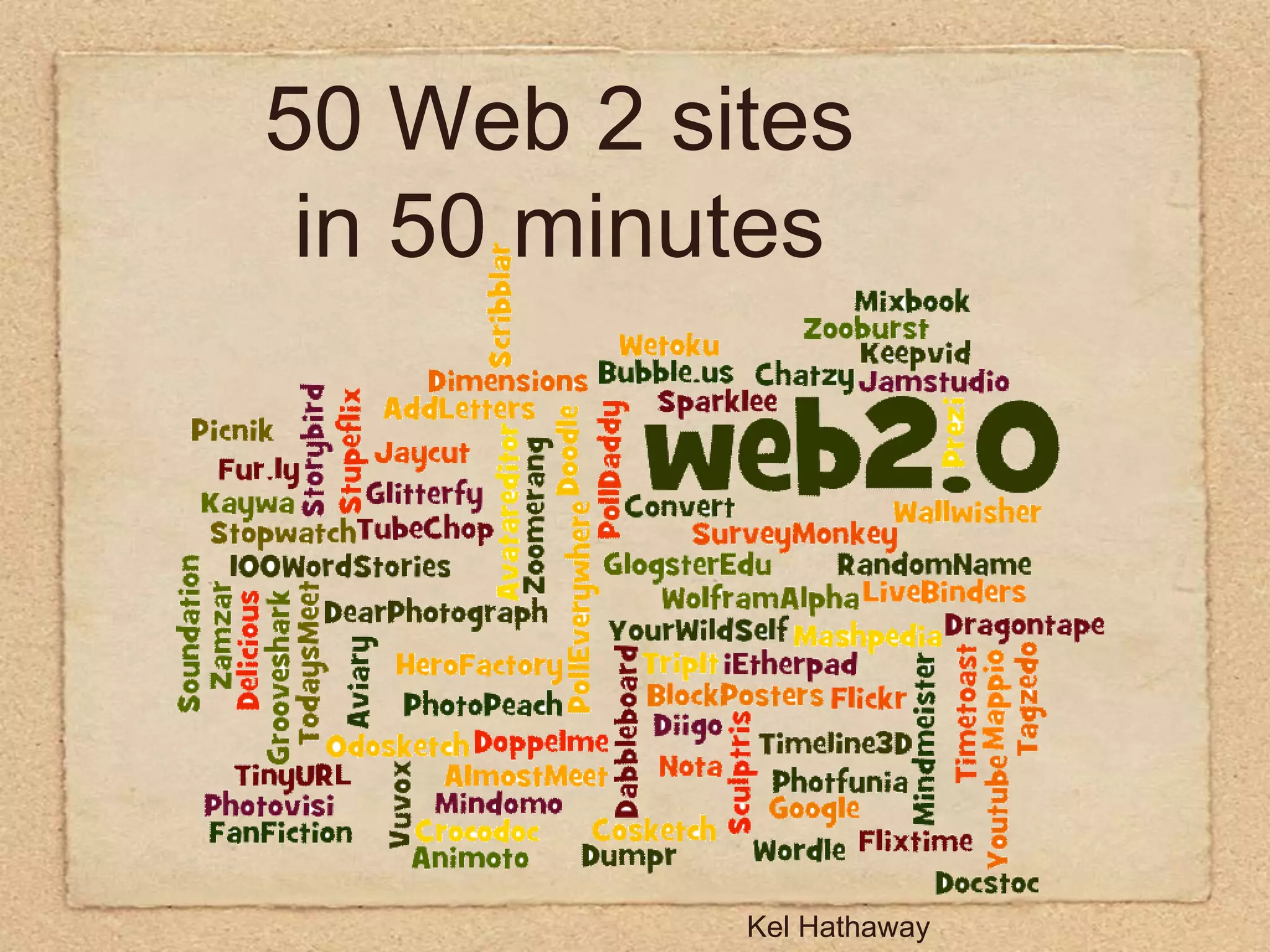 This document provides 50 Web 2.0 sites across various categories in 50 minutes. Some of the sites highlighted include Wordle for creating word clouds, TodaysMeet for student comments, SurveyMonkey for online surveys, TubeChop for embedding YouTube clips, GlogsterEdu for creating interactive posters, and Prezi for zooming presentations. Many additional sites are mentioned for blogging, image editing, timeline creation, file conversion, and more.