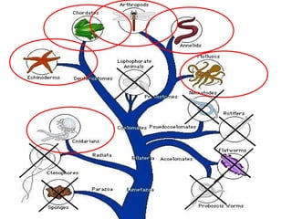 2. The document describes several animal phyla - Cnidaria, which includes jellyfish and coral, have stinging cells; Annelida includes segmented worms; Mollusks have a muscular foot and shells; Echinodermata are spiny with radial symmetry and tube feet; Arthropoda are the most successful and include insects, spiders, and crustaceans; and Chordata are backboned and include fish, amphibians, reptiles, birds, and mammals.