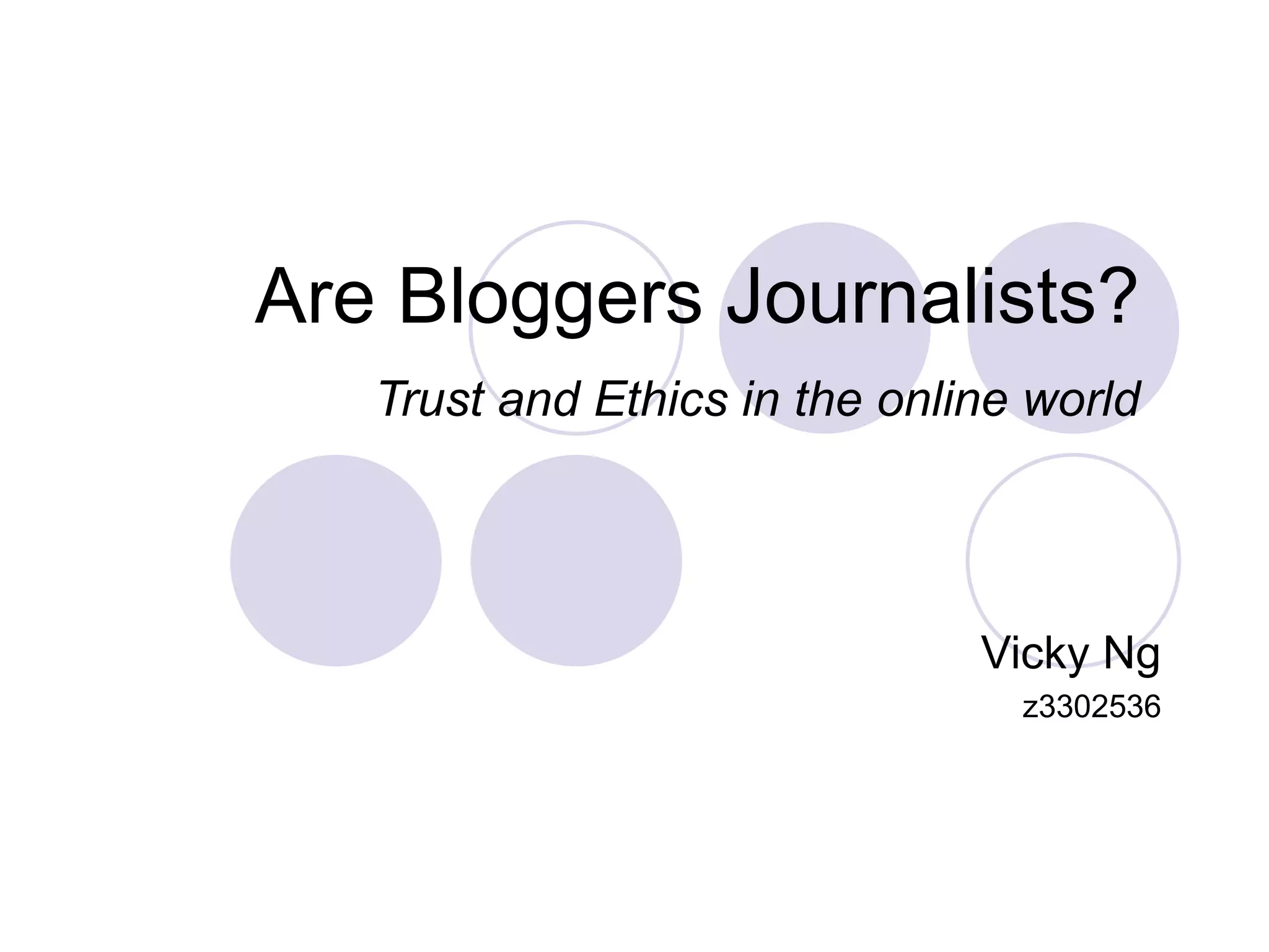 The document discusses whether bloggers should be considered journalists. It notes that the rise of new media has blurred the lines between traditional news and opinion. While blogs do not operate under the gatekeeping model of traditional media, the blogosphere has become a major source of news information. Attempts to define who qualifies as a journalist vary in terms of professional ethics, training, or content. Some legal rulings have recognized bloggers as journalists protected under shield laws. However, there are no universally agreed upon codes of ethics for bloggers or online journalists.