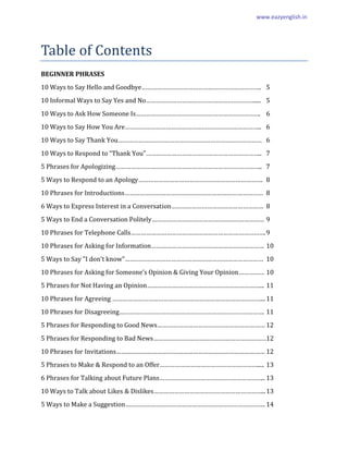 This document provides a summary of phrases organized by difficulty level that can be used in various situations in English. It begins with beginner phrases for greetings, apologies, introductions, opinions, and small talk. Intermediate phrases cover requests, complaints, memories and more. Advanced phrases handle complex topics like statistics, talents, luck and predictions. The document promotes additional English learning resources and courses on speaking, vocabulary, listening and other skills.