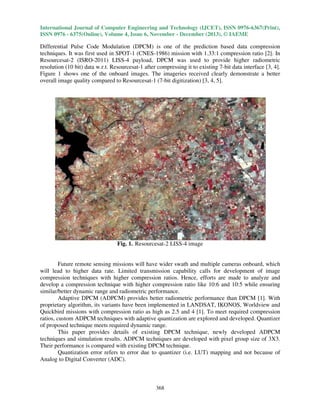 This document summarizes the development of new ADPCM image compression techniques that provide higher compression ratios than existing DPCM techniques while maintaining similar or better radiometric performance. It describes existing DPCM compression used in previous missions, and then presents two new ADPCM techniques - ADPCM (10:6) and ADPCM-RA (10:5) - that use multiple adaptive quantizers and achieve compression ratios of 10:6 and 10:5 respectively. Simulation results show the new ADPCM techniques significantly improve radiometric performance over DPCM for a variety of image types, particularly for high contrast images. The new techniques also recover a large portion of pixel values losslessly.